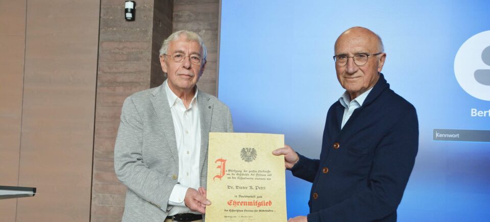 Den wichtigen Beschluss konnte Studiendirektor a. D. Bertram Sandfuchs, 1. Vorsitzender und Präsident des Historischen Vereins für Mittelbaden, gleich zu Beginn bekanntgeben: „Die Versammlung hat einstimmig beschlossen, Dr. Dieter K. Petri die Ehrenmitgliedschaft zu verleihen.“ Mit seinen herausragenden Verdiensten in der Geschichtsforschung habe er sich diese Auszeichnung mehr als verdient, würdigte Bertram Sandfuchs unter dem anhaltenden Applaus der Anwesenden die Verdienste von Dieter Petri. Als äußeres Zeichen überreichte er ihm die Ernennungsurkunde.