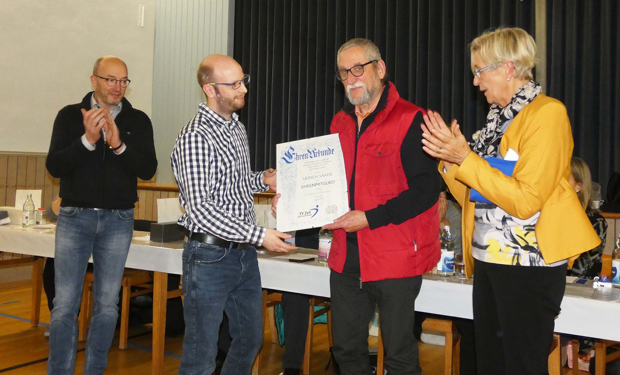 Foto: Inka Kleinke-Bialy„Nun haben wir noch eine Überraschung“, kündigte Sybille Nock, Vorsitzende des Turnvereins (TV) Zell, für das Ende der jüngsten Mitgliederversammlung an. Und ernannte Ulrich Saade ob seines außerordentlichen Einsatzes zum Ehrenmitglied – „unsere höchste Auszeichnung, die wir vergeben können“.