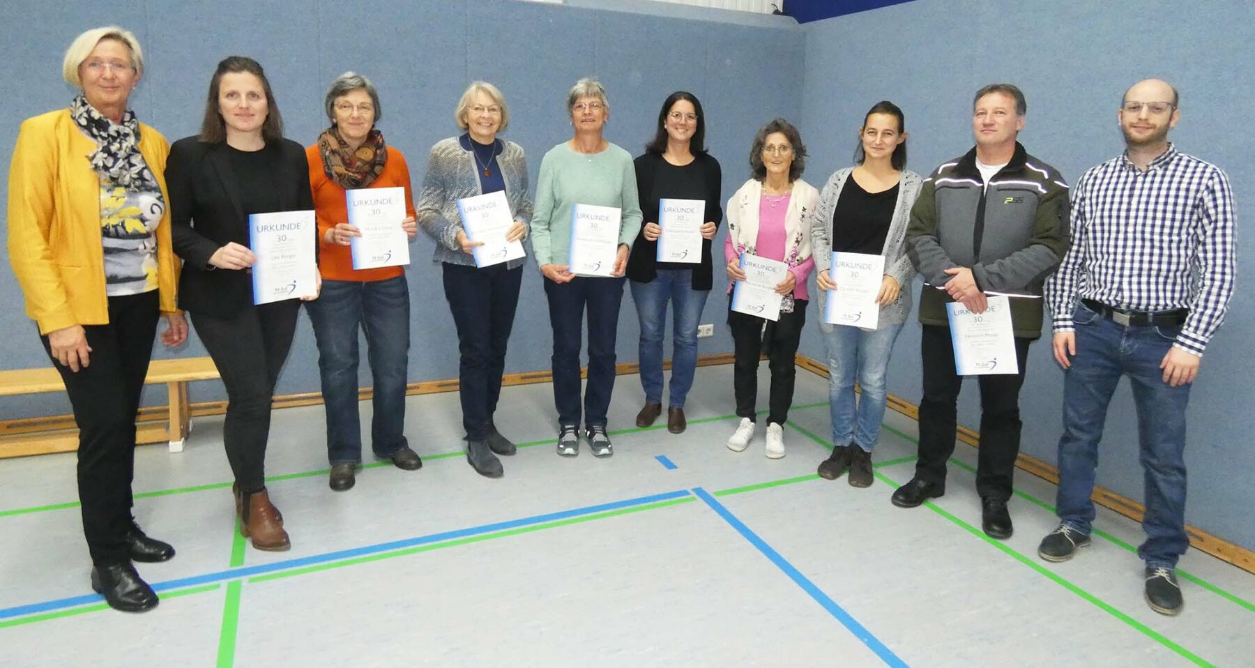 Seit 60 im Turnverein ist Brunhilde Hiss und mit ihren 89 Jahren noch immer voll Freude bei der Mittwochsriege der Frauen sowie bei jeder geselligen Runde aktiv dabei. Die Vereinsvorsitzende betonte: „Du bist das beste Beispiel dafür, dass Turnen und Bewegung bis ins hohe Alter gut tun.“ Für 60 Jahre Vereinstreue bedankte sich Sybille Nock zudem bei Freitagsturner Manfred Lehmann, der sich stets mit seiner Arbeitskraft und vielfältiger Unterstützung einbringe.