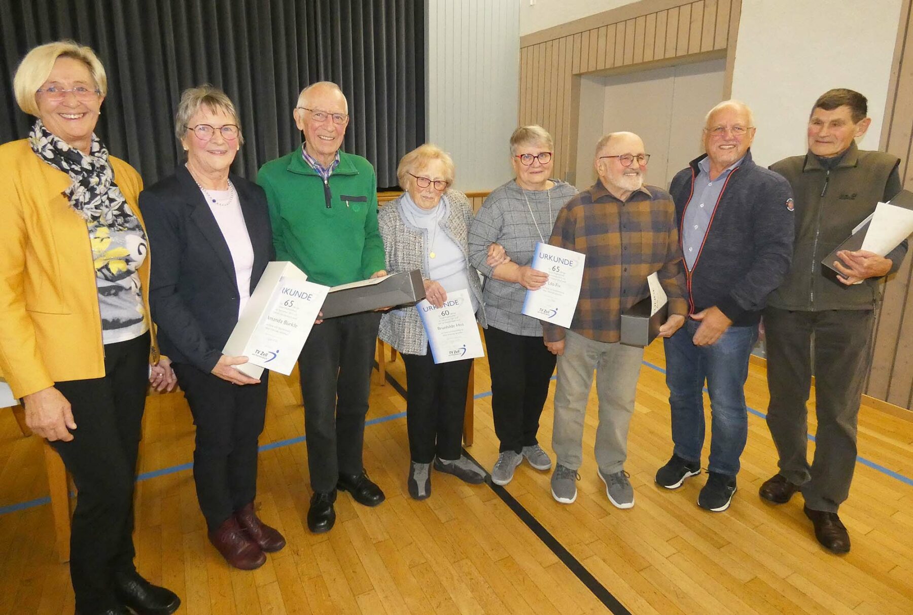 Eine Ehrung für 65 Jahre Vereinstreue erhielten: Ehrenvorsitzende Amanda Bürkle (war sechs Jahr zweite und 14 Jahre Erste Vorsitzende, ist bis heute die Übungsleiterin bei den Mittwochsfrauen), Klaus Pfaff (noch immer Mitglied, obwohl er inzwischen in Denzlingen wohnt), Ehrenmitglied Hans Willmann („Die meisten hier im Saal können sich an eine Turnstunde mit Dir erinnern“, so Sybille Nock: Der ehemalige Leistungsriegen-Turner und Turnwart war ein halbes Jahrhundert lang Übungsleiter im Kinderturnen), sowie Ehrenmitglied Lilo Fix (seit Jahrzehnten im Vorstand tätig, heutzutage Interessenvertreterin Frauen, seit über 50 Jahren Übungsleiterin „und immer auf allen Fortbildungen.“)