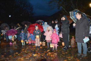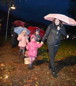 Foto: Hanspeter SchwendemannBeim Sankt-Martins-Umzug am Montagabend in Unterharmersbach mussten die großen und kleinen Teilnehmer mit Sturm und Regen kämpfen. Trotzdem ließen sich die Erzieherinnen und die Kinder von der „Kleinen Wolke“ nicht abschrecken und zogen zum Pavillon im Kurpark.