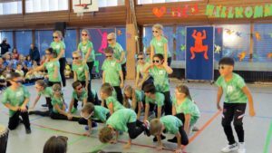 Die Kids der Klasse 4 b zeigten in einzelnen Formationen, dass sie gut synchron tanzen können. Ob sie die turnerischen Elemente wie Rad schlagen und Handstand auch im Tanzunterricht gelernt haben? Am Ende bauten sie die größte Kinderpyramide des Nachmittags mit fast zehn Kindern. Ihr Abschluss war witzig: Sie drehten sich sehr lange sehr schnell um sich selbst und ließen sich dann einfach fallen. Dafür gab es frenetischen Applaus der Zuschauer.