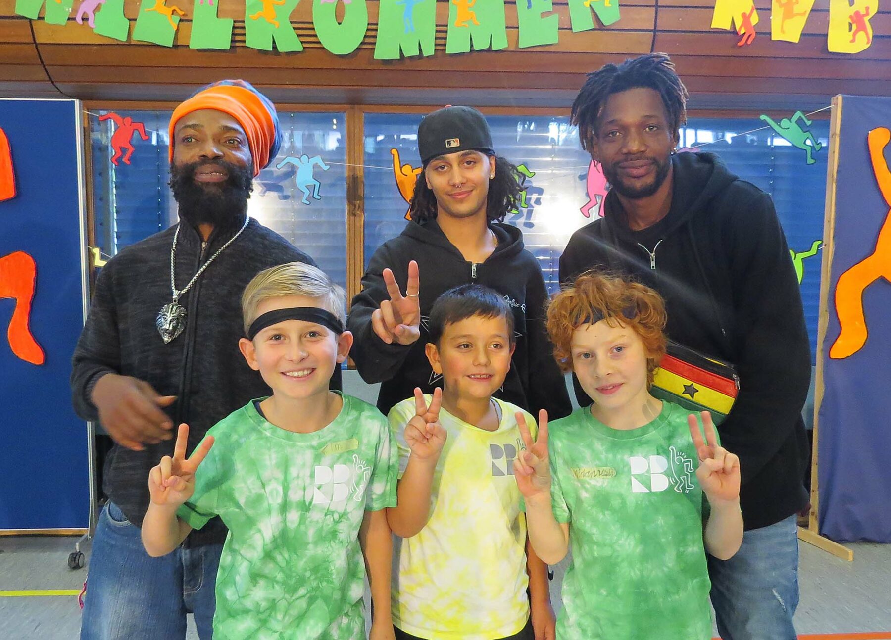 Die Klasse 4 a begann ihren Tanz mit dem Ausruf: „It‘s Showtime!“ und eine Show zeigten sie dann auch. Sie hatten Gitarren aus einfachen Materialien selbst gebaut und spielten Luftgitarre. Nach ihrem mit vielen Tanzelementen gespickten Tanz haben sie am Ende sogar eine Verbeugung einstudiert. Die Zuschauer forderten vehement eine Zugabe und die gab es auch. Nach dem prägnanten Rhythmus von „We will rock you“ der Popgruppe Queen machten alle Grundschulkinder mit, sie klatschten und stampften begeistert mit. Am Ende waren auch die Eltern dabei und die ganze Halle bebte zu dem Rhythmus. Ein gelungener Abschluss des großartigen Nachmittags: Mit einfachen Mitteln, viel Begeisterung und einem guten Gespür für die Kinder und ihrem Bedürfnis nach Bewegung haben die drei Tanz-Coaches den Workshop mit einem fulminanten Höhepunkt abgeschlossen.