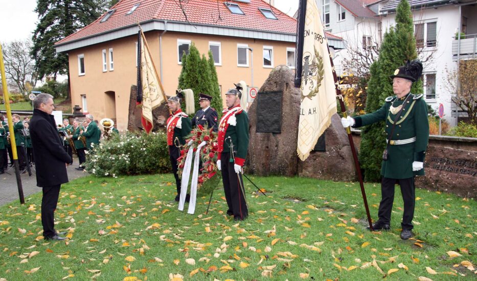 Am diesjährigen Gedenken für die Toten der Kriege nahmen wie alljährlich die Formationen der Bürgerwehr mit Gewehrträgern, Spielmannszug und Trachtenfrauen, sowie eine Abordnung der Feuerwehr teil. Die musikalische Gestaltung übernahm die Stadtkapelle unter Leitung von Stefan Polap und der Gesangverein Frohsinn unter Leitung von Christian Lauer. Am Denkmal hielt Bürgermeister Pfundstein eine Gedenkrede.