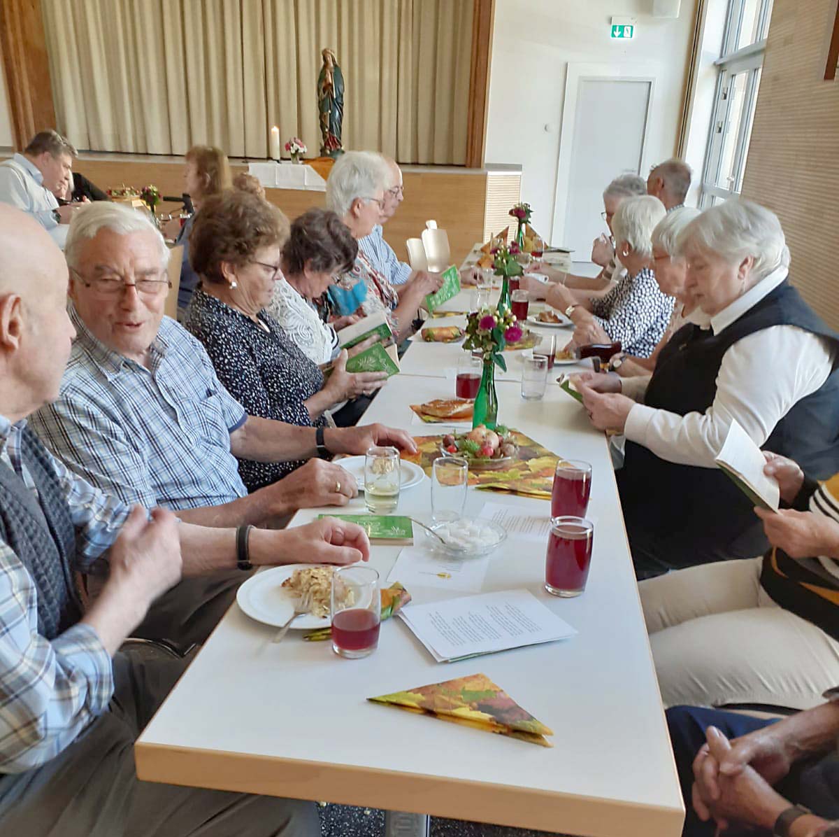 Allein schon die milde Herbstsonne lockte die Senior*innen in das herbstlich geschmückte Pfarrheim. Der Nachmittag begann mit einer besinnlichen Marienandacht, die Diakon Matthias Hoppe gestaltete. Mit Texten aus dem Evangelium wurden einige Stationen aus dem Leben Marias, die „Mutter der Glaubenden“, vorgetragen und betrachtet, durch Gebete ergänzt und mit Marienliedern feierlich umrahmt.