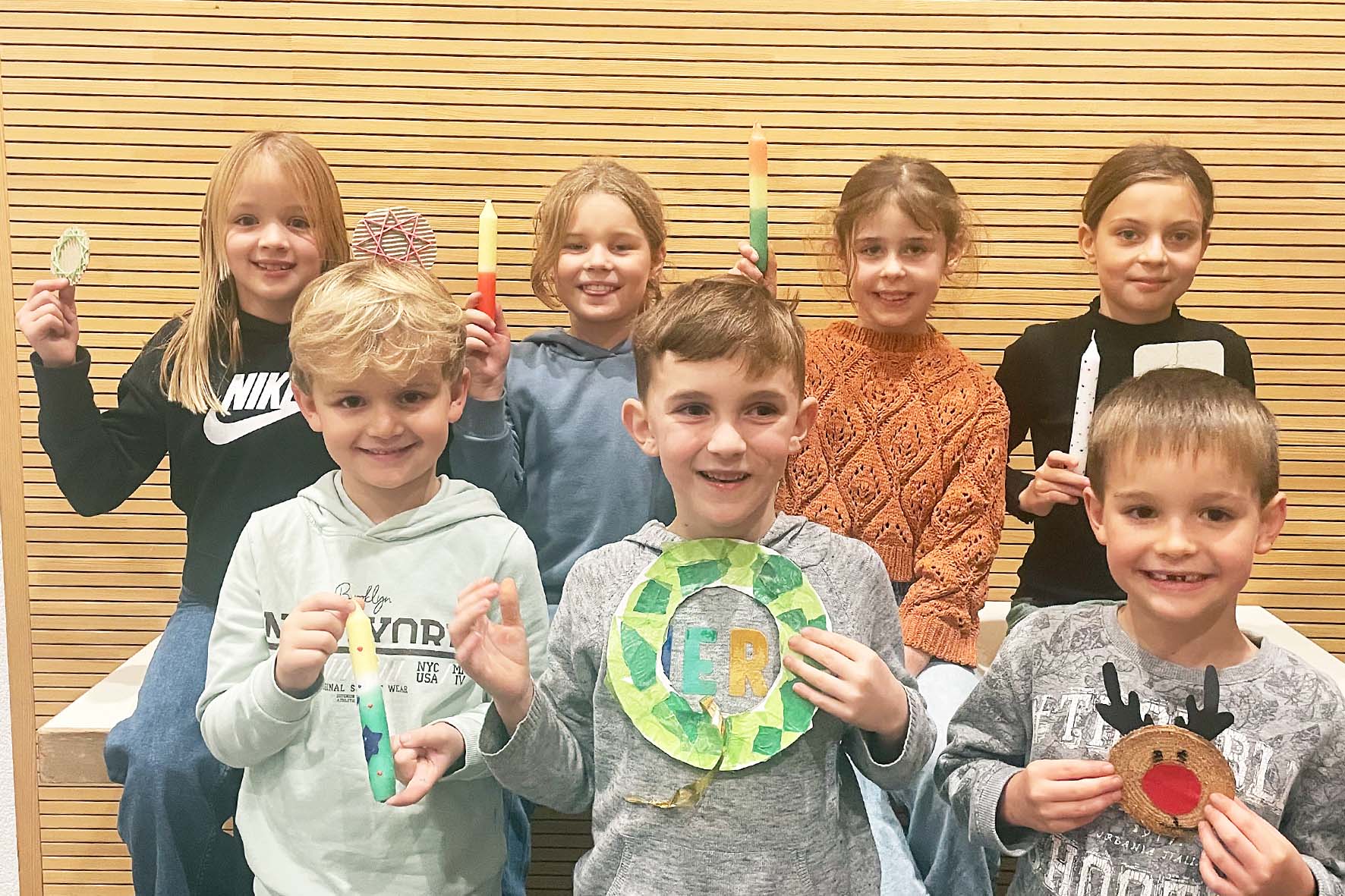 Ein engagiertes Bastelteam mit kreativen Köpfen hatte an zwei aufeinander folgenden Tagen im Advent zum Basteln von kleinen Weihnachtsgeschenken eingeladen. Unter Anleitung konnten die Kinder aus sieben Angeboten wählen. Originelle Weihnachtskarten, Wichtel aus Astholz, Elche aus Baumscheiben, Türkränze, Sterne aus Butterbrotpapier und Wolle sowie das obligatorische Kerzenziehen wurden vom Bastelteam so vorbereitet, dass die Kinder gleich mit Feuereifer loslegen konnten.