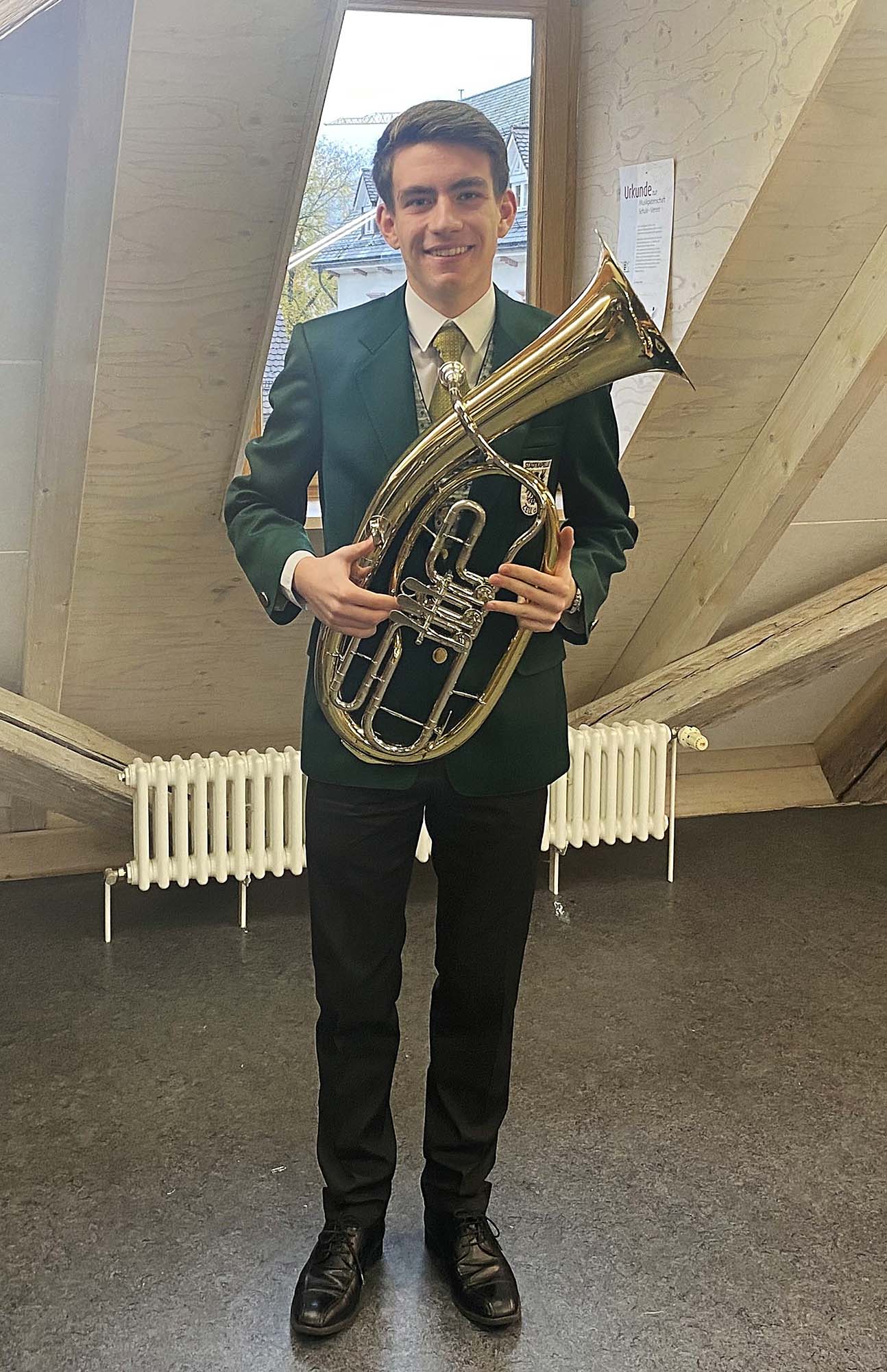 Einer musikalischen Herausforderung stellt sich in diesem Jahr Roman Armbruster am Tenorhorn. James Curnow komponierte das Werk „Rhapsody for Euphonium“ ursprünglich, um seine Musikschülerinnen und -schüler zu fordern. Dieses anspruchsvolle Stück präsentierte Roman im Frühjahr 2023 in Staufen. Dort legte er in der Musikakademie des Bundes Deutscher Blasmusikverbände e.V. mit Bravour das Jungmusiker-Leistungsabzeichen in Gold ab. Dies ist die höchste Auszeichnung der BDB-Bläser jugend. Die Jungmusikerinnen und Jungmusiker bereiten sich zunächst in ihren Vereinen intensiv auf die Prüfungen vor. Zum Vorbereitungskurs geht es dann für eine Woche nach Staufen. Nach einer intensiven Probewoche, mit auch vielen geselligen Stunden, werden dann die verschiedenen Lernfelder wie zum Beispiel Musiklehre, Intonationskunde oder Gehörbildung geprüft. Im Praxisteil zeigen die Musikerinnen und Musiker ihr Können bei einem Vortragsstück mit Klavierbegleitung, dem Vom-Blatt-Spiel und dem Tonleiterspiel. Die Stadtkapelle ist besonders stolz in diesem Jahr gleich zwei Goldabsolventen in ihren Reihen zu haben. Neben Roman Armbruster zeigte Melvin Seith seine musikalischen Fertigkeiten am Saxophon.