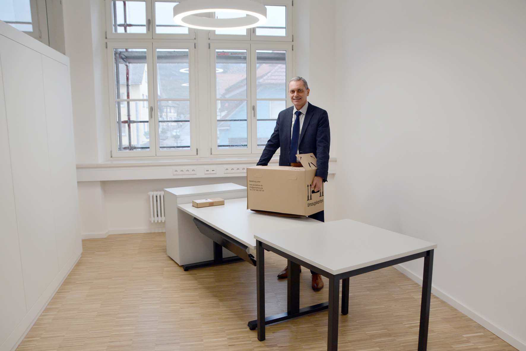 Die Akten und Unterlagen sind in Umzugskartons verpackt. Auch die IT ist umzugsbereit. Nur über wenige Treppenstufen geht es für Bürgermeister Pfundstein zurück in den sanierten Altbau. Zurück bleibt der dunkelbraune Schreibtisch, an dem schon sein Vorgänger Hans-Martin Moll gearbeitet hat. Der Schreibtisch ist in solch einem alten Zustand, dass er nur noch entsorgt werden kann.