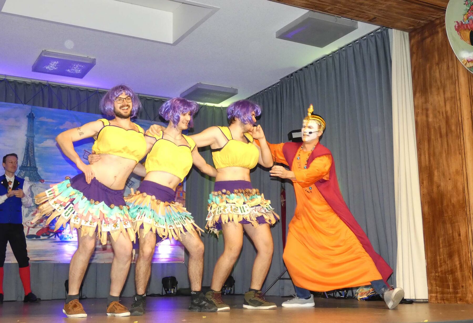 Nicht minder zum Lachen das Männerballett mit dem Märchen „Des Königs neue Kleider“. Mit jedem Ruf nach Zugabe lief das parodierende Geschehen auf der Bühne erneut und doch ein wenig anders ab, entledigten sich die Akteure Schicht für Schicht ihrer Kleidung – bis, ja bis, wie eingangs erwähnt, auf schließlich Unterhose, Kniestrümpfe und Schläppchen. Das Publikum johlte und grölte. „Genau des isch es, so muss Fasend si“, kommentierte ein Zuschauer die Stimmung.