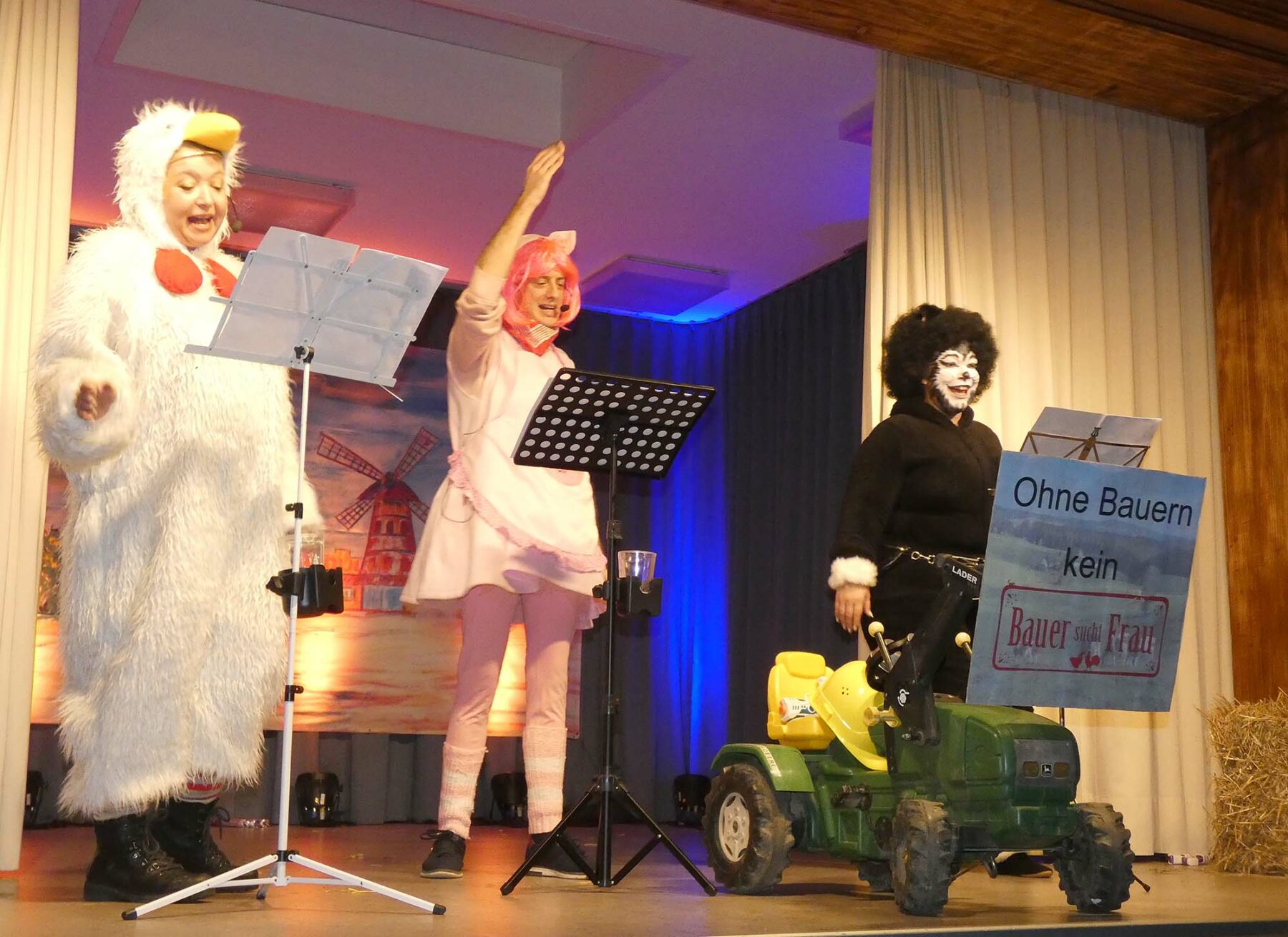 Und schon gaben sich die Zeller Wappentiere auf der Bühne die Ehre. Zumindest die Hoorig Katz und die Fedrig Henn standen eifrig parat – die Borschdig Sau aber ließ ein wenig auf sich warten: Mit ihrem Mini-Traktor und in rosigem Pink war sie soeben von einer Bauerndemo aus Berlin zurückgekehrt – gerade noch rechtzeitig, um gemeinsam mit den anderen beiden Viechern durch den Kakao zu ziehen, wer oder was sich nur irgend anbot. Egal ob beispielsweise Klimakleber, Bürgermeister „Pfundi“ oder andere lebende respektive nicht mehr lebende Zeller Honoratioren, und auch der ach so abundante Busverkehr zwischen Nordrach und Zell bekam sein Fett weg. Weil so viel Kikeri, Grunzen und Miauen durstig machte, benötigten die närrischen Wappentiere etwas zu trinken. Flugs wurden sie von Kellnern mit durchtrainierten nackten Beinen bedient. Was nur mochte da noch kommen?
