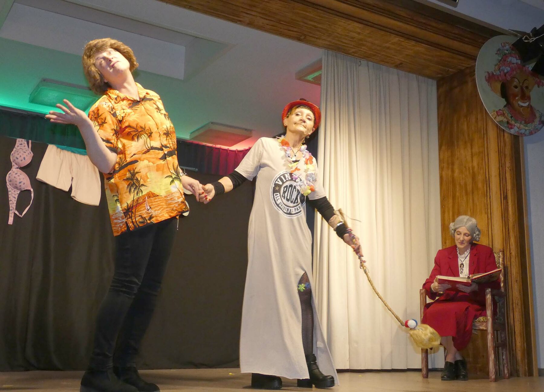 Dem Mittler zwischen der hiesigen und der „geistigen Welt“ gab letztere unter beeindruckenden körperlichen Zuckungen ein, dass im Jahre 2024 endlich eine Rätin die närrische Führungsriege Zells aufmischen solle. Zur Wahl stellten sich Chantal us em Hombe, Steffi von der Muser sowie Gisela us Neuhuuse. Bart und männlich behaarten Beinen zum Trotz betörten alle drei mit enthusiastischer Anmut und Schönheit, als es zwecks Beurteilung ihrer Qualifikation verschiedene Aufgaben zu bewältigen galt. Von Publikumsapplaus und der geistigen Welt bestimmt, machte Gisela das Rennen als Narrenrätin, ihre Kontrahentinnen lagen sich ob der „Niederlage“ modellwettbewerbsmäßig in den Armen, der Saal war hingerissen.