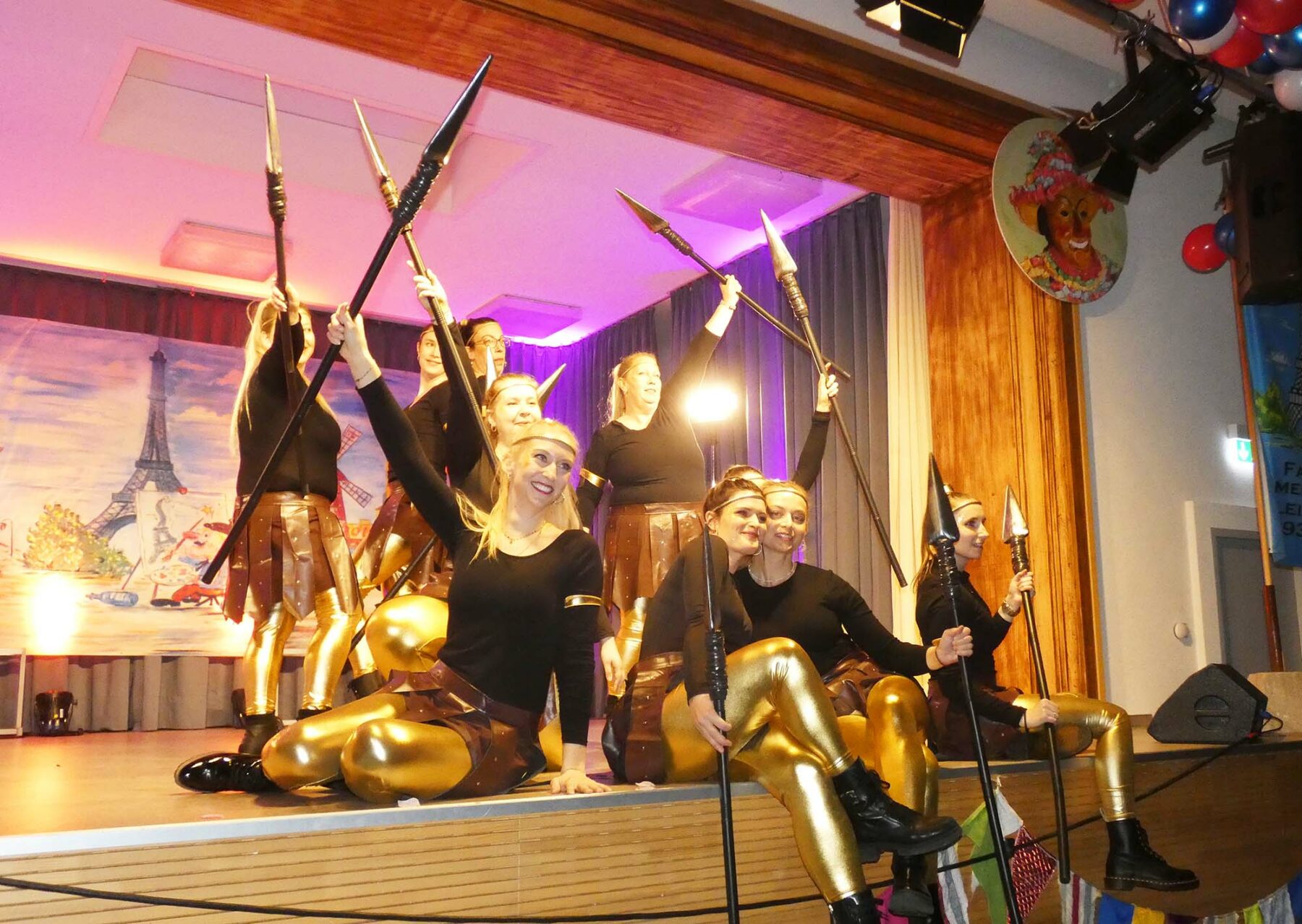 Martialisch-rhythmische Klänge veranlasste biegsame „Hüpfdohlen“ zu einem mit Speeren bewaffneten Tanz, von Zugaberufen belohnt. Geburtstagsdohle Lena Franke erhielt auf der Bühne ein Geburtstagsständchen samt Kuchen, daraufhin donnerte eine Konfettikanone. Einmal auf die Tische und zu Boden gefallen, sorgte das handlich-glitzernde Jubelzeug fortan für spontan wiederkehrende Jubelaktionen. Dazu schoben entsprechend Veranlagte das Jubelmaterial auf ihrem Tisch zu Jubelhäufchen zusammen, um es bei jedem sich bietenden Anlass jubelhauchend in die Luft zu werfen.