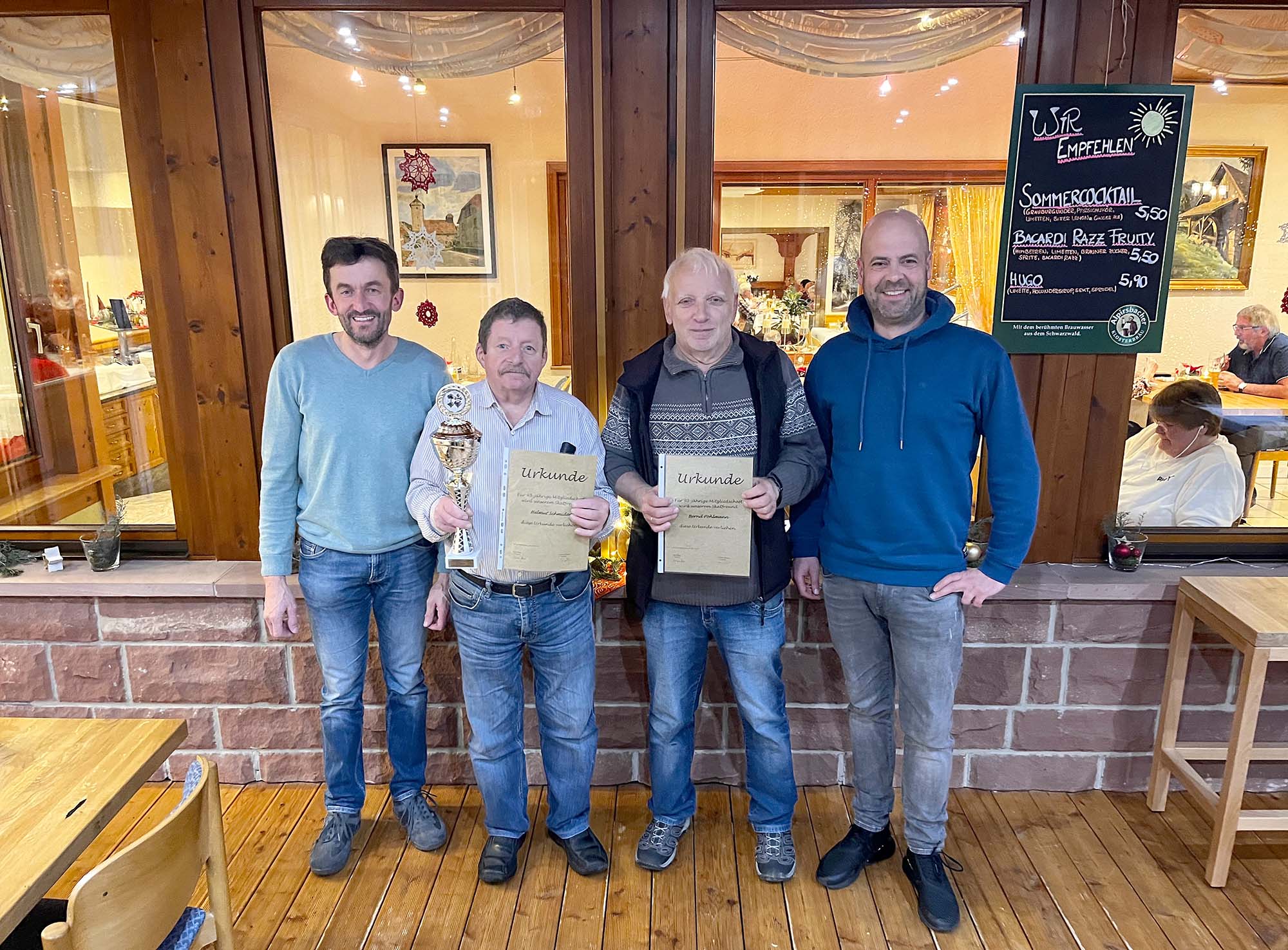 Bei der Jahresabschlussfeier 2023 des Skatclubs „Mitternachtsbuben“ wurden zwei Mitglieder durch den neuen Vorstand Simon Haas und Thomas Hilberer geehrt. Helmut Schmider ist seit für 45 Jahre aktiver Skatspieler. Bernd Pohlmann konnte für 30 Jahre treue und erfolgreiche Mitgliedschaft geehrt werden.