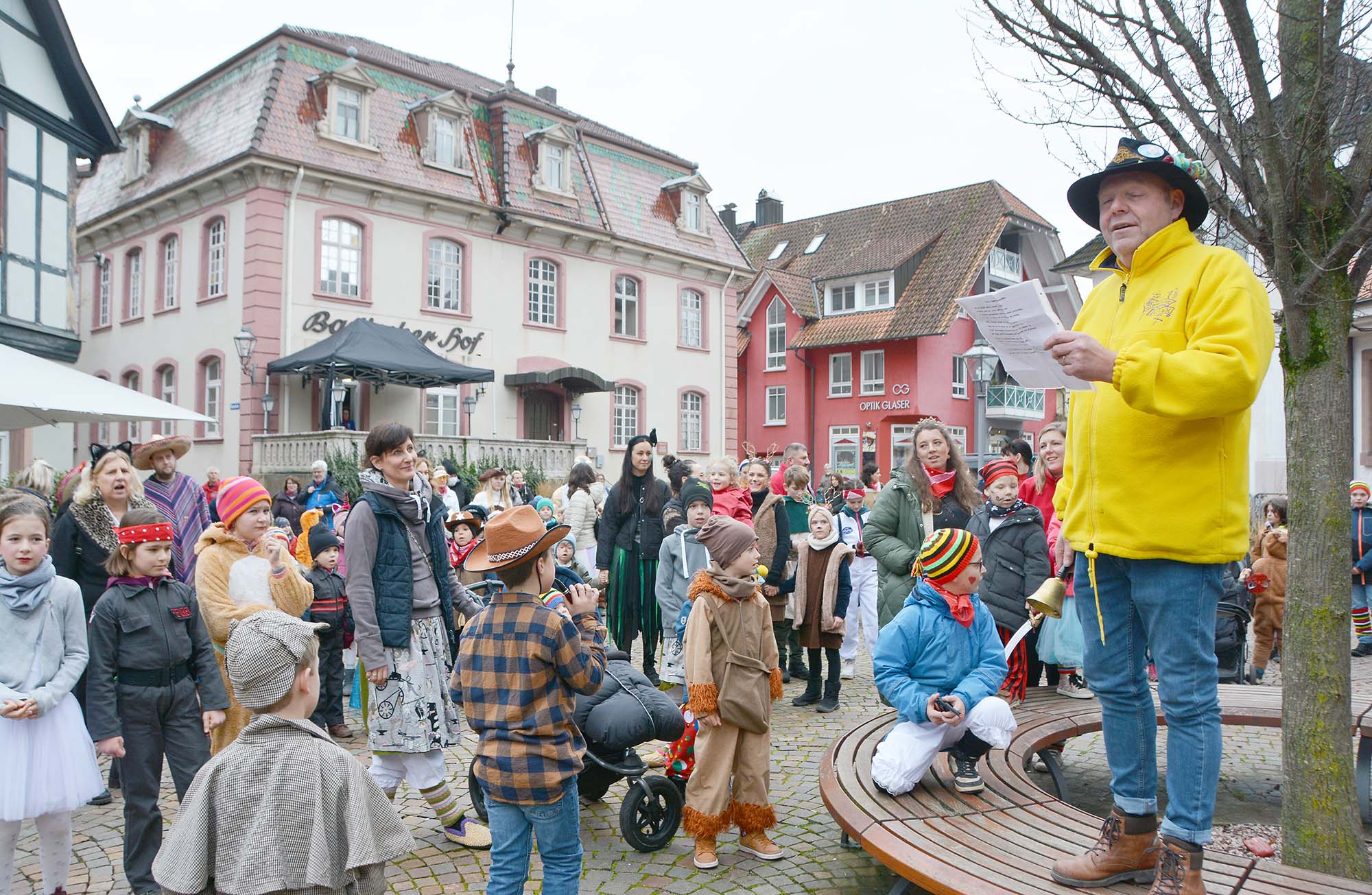 »Moche alle mit, damit es ä gute Fasend gibt«, rief Zunftmeister Clemens Halter allen Kindern und auch den Erwachsenen zu. Foto: Hanspeter Schwendemann
