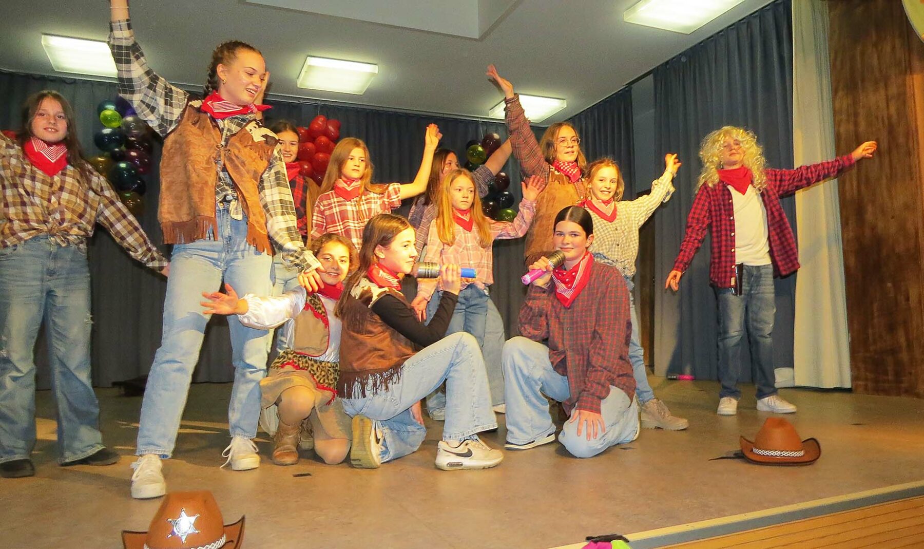 Nach der närrischen Begrüßung von Pfarrer Gerner kamen die Ministranten in Cowboykostümen auf die Bühne. Zur Wes ternmusik legten sie einen fetzigen Tanz hin – sie haben offensichtlich viel geübt, denn alles klappte bestens.