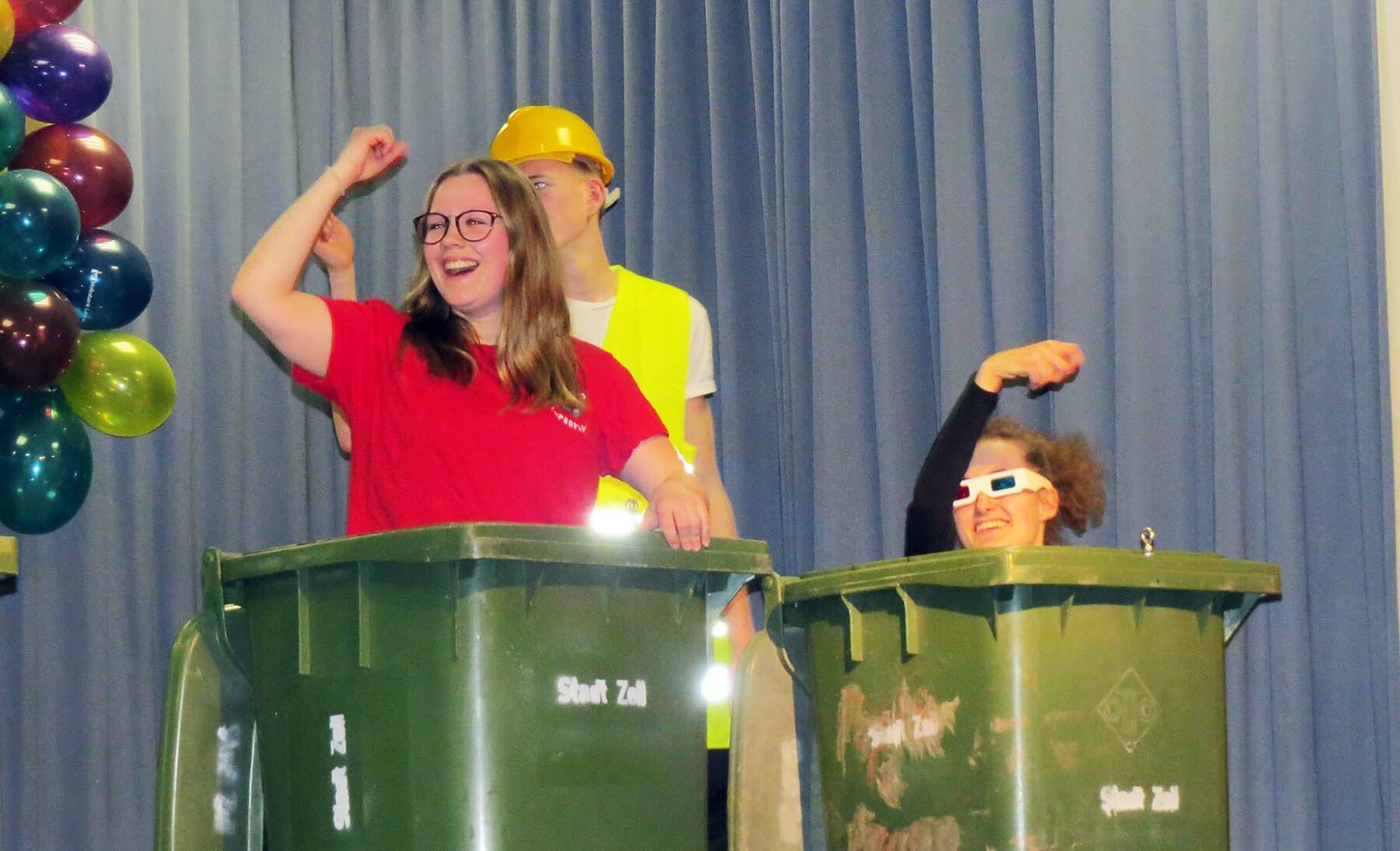Die Leiterrunde der Ministranten feierten eine Mülltonnenparty auf der Bühne. Die Jugendlichen nutzen die Tonnen zum Trommeln und um darin Schlagerstars zu verstecken. Helene Fischer aus der Tonne – das gibt’s nur bei der Pfarrfasend. Eine tolle Nummer, für die es viel Applaus der Zuschauer gab.