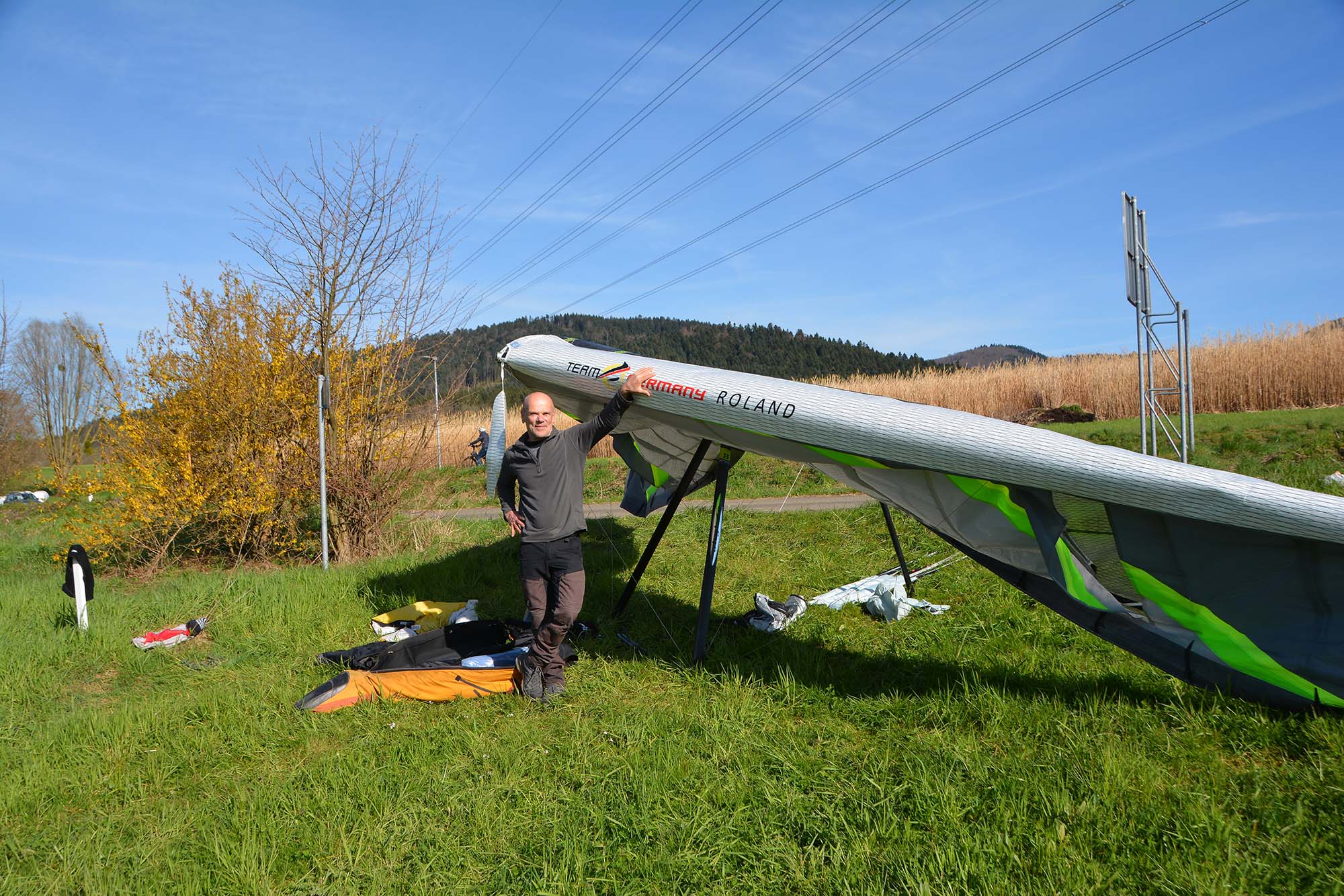 Als Vertreter der Nationalmannschaft der Drachenflieger hat Roland Wöhrle aus Gutach die Kooperation mit den Gröbernhof-Golfern in trockene Tücher gebracht. „Sowohl die Flug- als auch die Landebedingungen hier in Zell sind ideal“, betont der mehrfache Deutsche Meister. Damit am Ostermontag alles gut klappt, hat er vorgestern nochmals alles auf Herz und Nieren getestet.