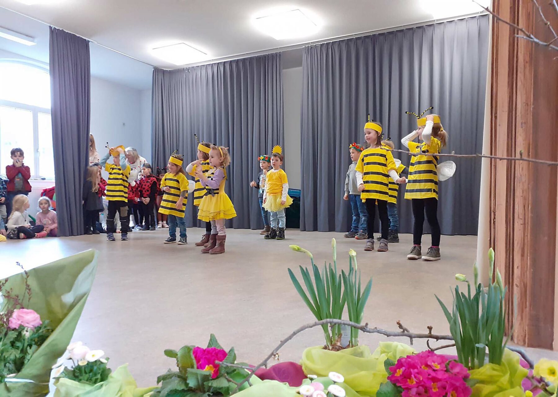 Nach der Kaffeerunde bei Akkordeonmusik steuerte das Frühlingsfest auf den nächsten Höhepunkt zu: Der Auftritt der Kinder des Kindergartens „Sternschnuppe“ unter der Leitung ihrer Kindergartenleiterin Ingrid Mattheis und ihren Erzieherinnen mit einem bunten und unterhaltsamen Programm.