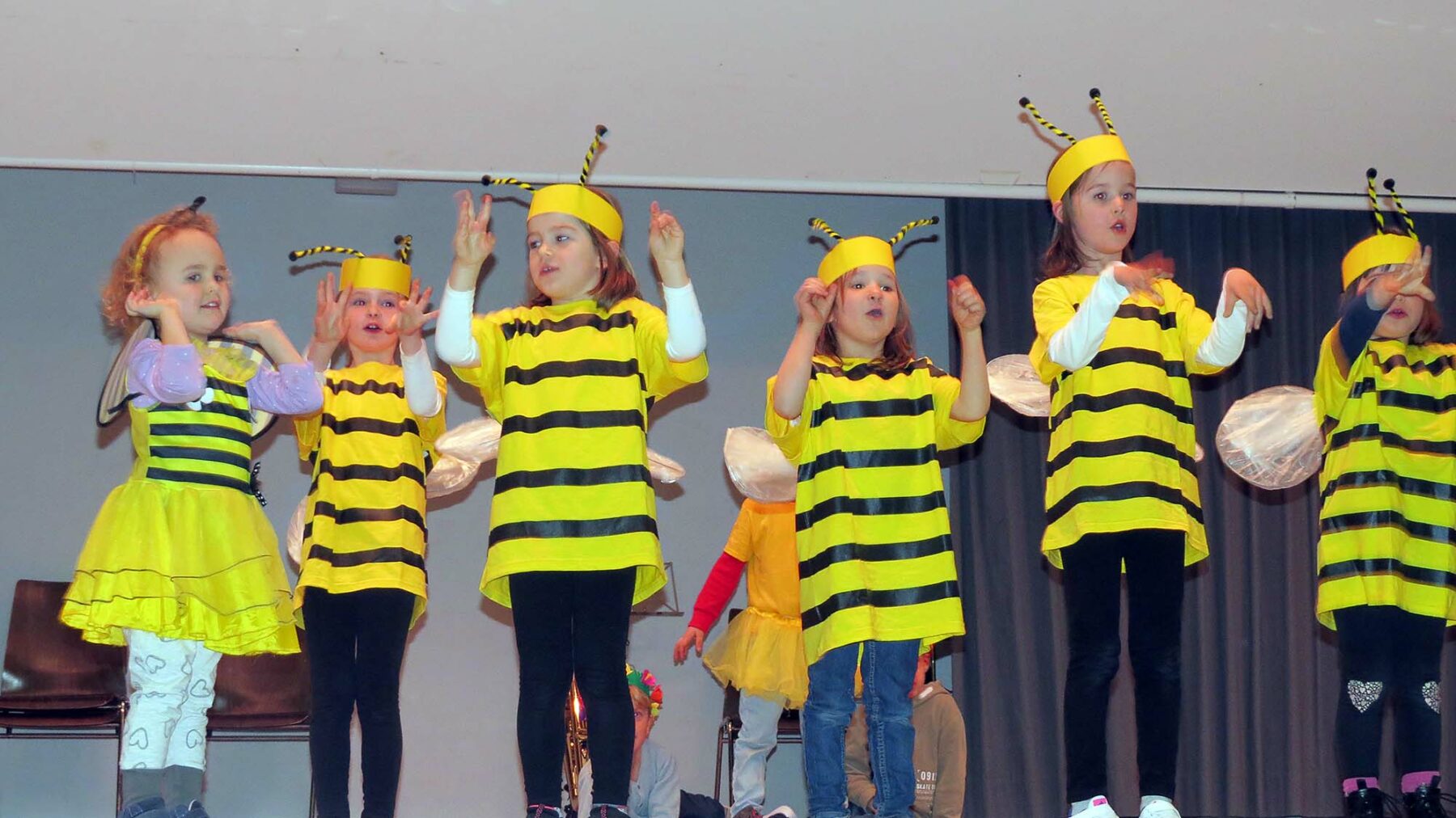 Nach der Rede des Bürgermeisters kamen die Kinder des Kindergartens Sternschnuppe mit ihren Erzieherinnen auf die Bühne. Unter Leitung von Ingrid Mattheis zeigten sie ein Programm passend zum Thema Frühling. Als kleine Blumen, Bienen, Käfer, Schmetterlinge oder als Sonne verkleidet, waren sie sehr niedlich anzusehen. Zu Liedern vom Band zeigten sie unbefangen, wie Bienen fliegen, Blumen beginnen zu wachsen, Käfer sich bewegen und kleine Gärtner alles begießen. Wie das mit der Paarung der Käfer funktioniert, wurde ebenfalls in einem Lied besungen und war sehr amüsant anzuschauen. Mit einem schönen Auftritt der Bienen endete ihr Programm und der Applaus der Gäste wurde ihnen gerne gespendet.