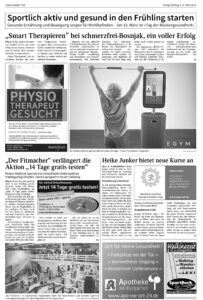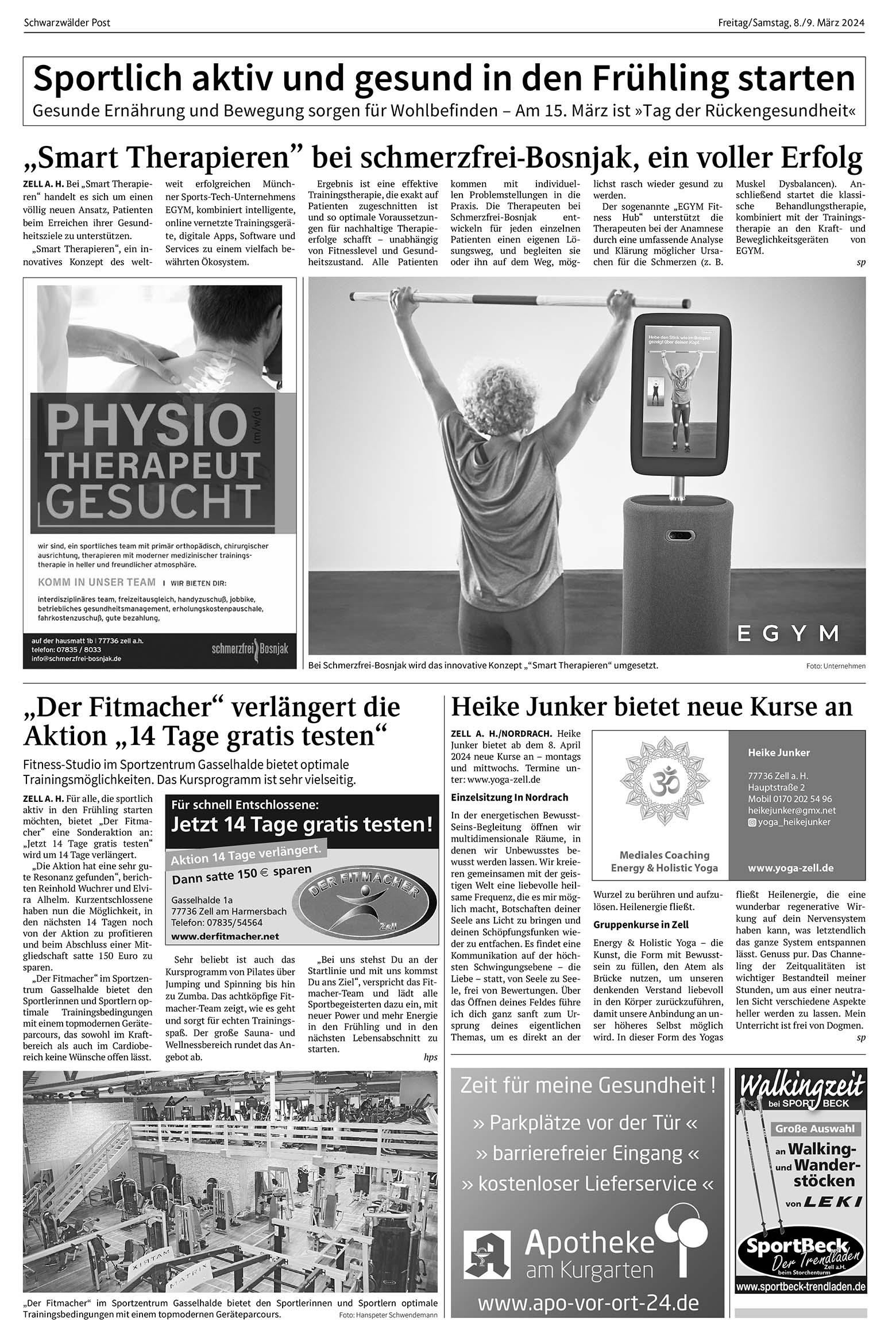 Zell am Harmersbach | 8.03.2024 Sportlich aktiv und gesund in den Frühling starten Foto:Bei Schmerzfrei-Bosnjak wird das innovative Konzept „“Smart Therapieren“ umgesetzt. Foto: Unternehmen von Schwarzwälder PostGesunde Ernährung und Bewegung sorgen für Wohlbefinden – Am 15. März ist »Tag der Rückengesundheit« Foto: Unternehmen Foto: UnternehmenDas könnte Sie auch interessieren:Foto: Reinhold Messner / MundologiaReinhold Messner: „Der Nanga Parbat hat…Foto: VereinDeftiger Abschluss für ein aktives TennisjahrFoto: Peter BaumannSchachclub Zell stürmt die Burg in Hornberg