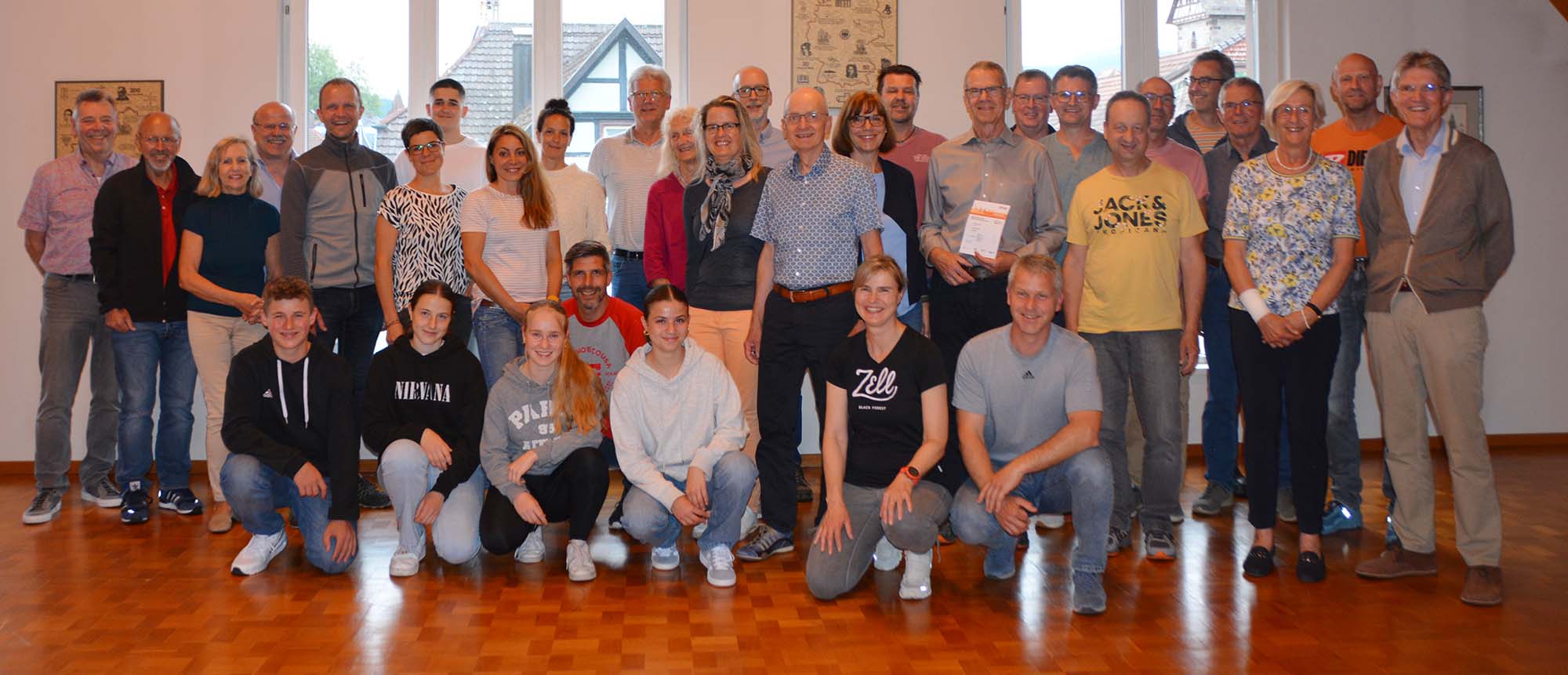 Die Sportlerinnen und Sportler, die im Jahr 2023 erfolgreich das Deutsche Sportabzeichen errungen haben. Leichtathletik-Abteilungsleiter Willi Lehmann (links) nahm die Ehrungen vor. Bei der Feier im Versammlungsraum der Volksbank Zell waren auch die beiden Turnvereins-Vorsitzenden Ludwig Börsig und Sybille Nock mit dabei. Foto: Marijke Heitzmann