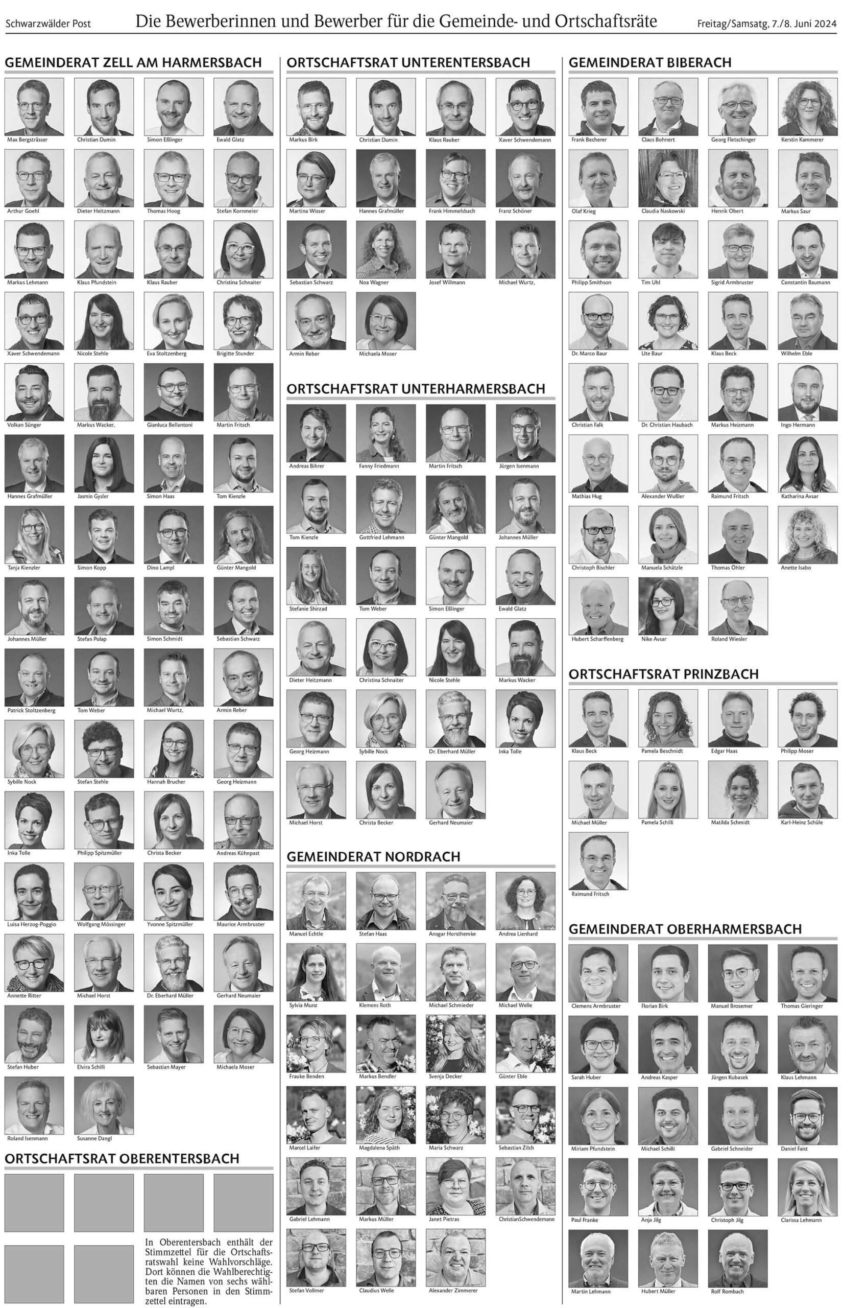 Unsere Bildgalerie auf der gegenüberliegenden Seite zeigt die 177 Bewerberinnen und Bewerber, die sich am kommenden Sonntag in Zell a. H., Biberach, Nordrach und Oberharmersbach sowie in den Ortschaften Unterharmersbach, Unterentersbach und Prinzbach für die Wahl der Gemeinde- und Ortschaftsräte zur Verfügung stellen.