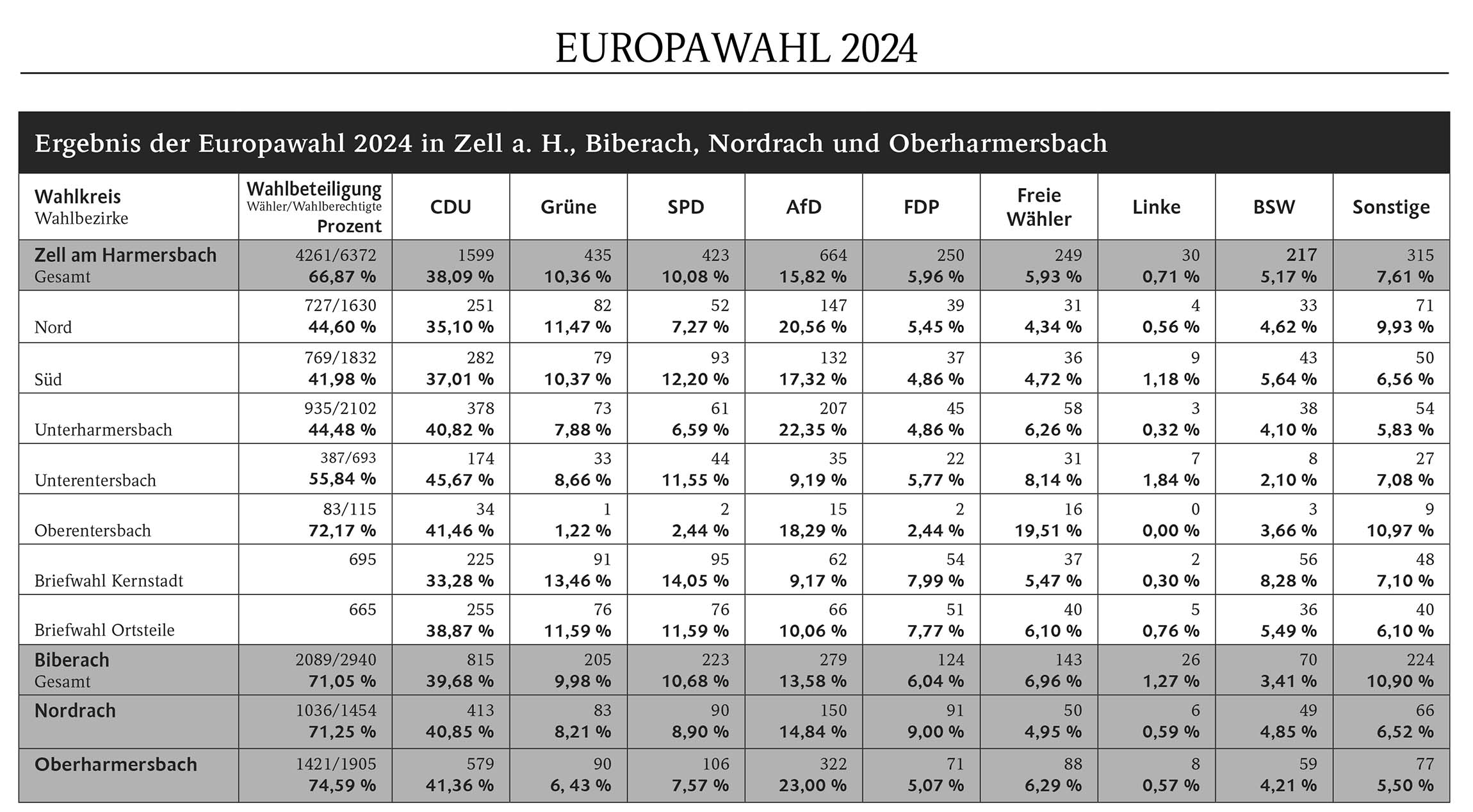 Biberach, Nordrach, Oberharmersbach, Zell am Harmersbach | 10.06.2024 Europawahl 2024 Foto: Foto: SP von Schwarzwälder PostDas könnte Sie auch interessieren:Foto: Grafik: Schwarzwälder PostHeimatbrief dokumentiert das Jahr 2024Freibad: Geliebt, genutzt, defizitärFoto: VereinNeue Ausstattung für die Juniorinnen des ZFV