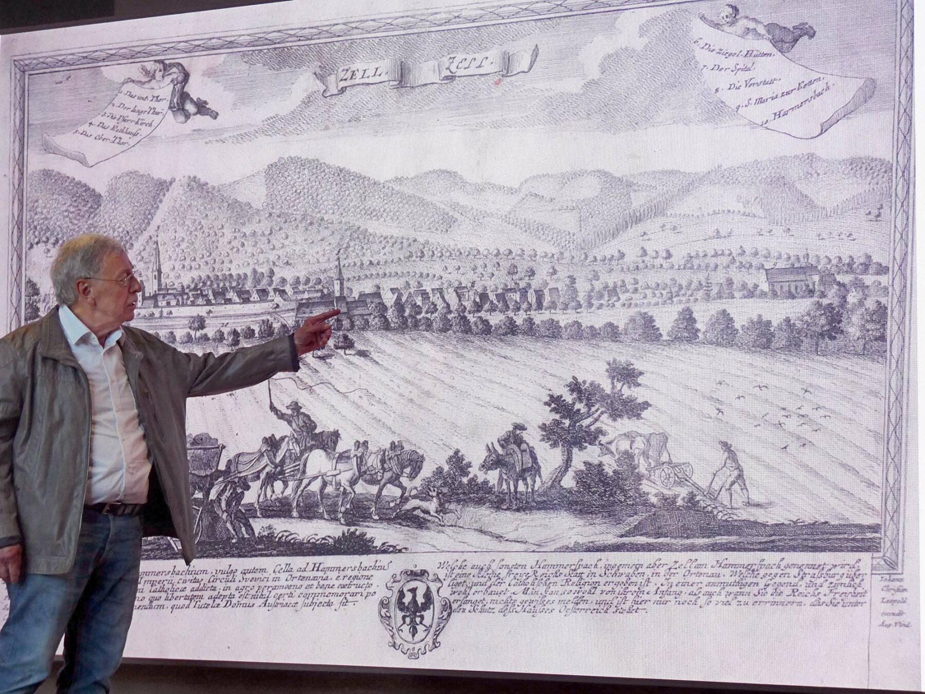 Spannend: Bertram Sandfuchs mit der ältesten Darstellung von Zell am Harmersbach, aus dem Jahre 1735. Diese Lithografie hat Johann Schreiber in seiner zur Ausstellung neu aufgelegten Familien geschichte aufgenommen: Im Vordergrund der Abbau damals riesiger Lehmvorkommen auf der Winterseite, mit denen später auch die Schreiber´schen Hafner gearbeitet haben dürften, im Hintergrund einstige Ziegel-Hütten.