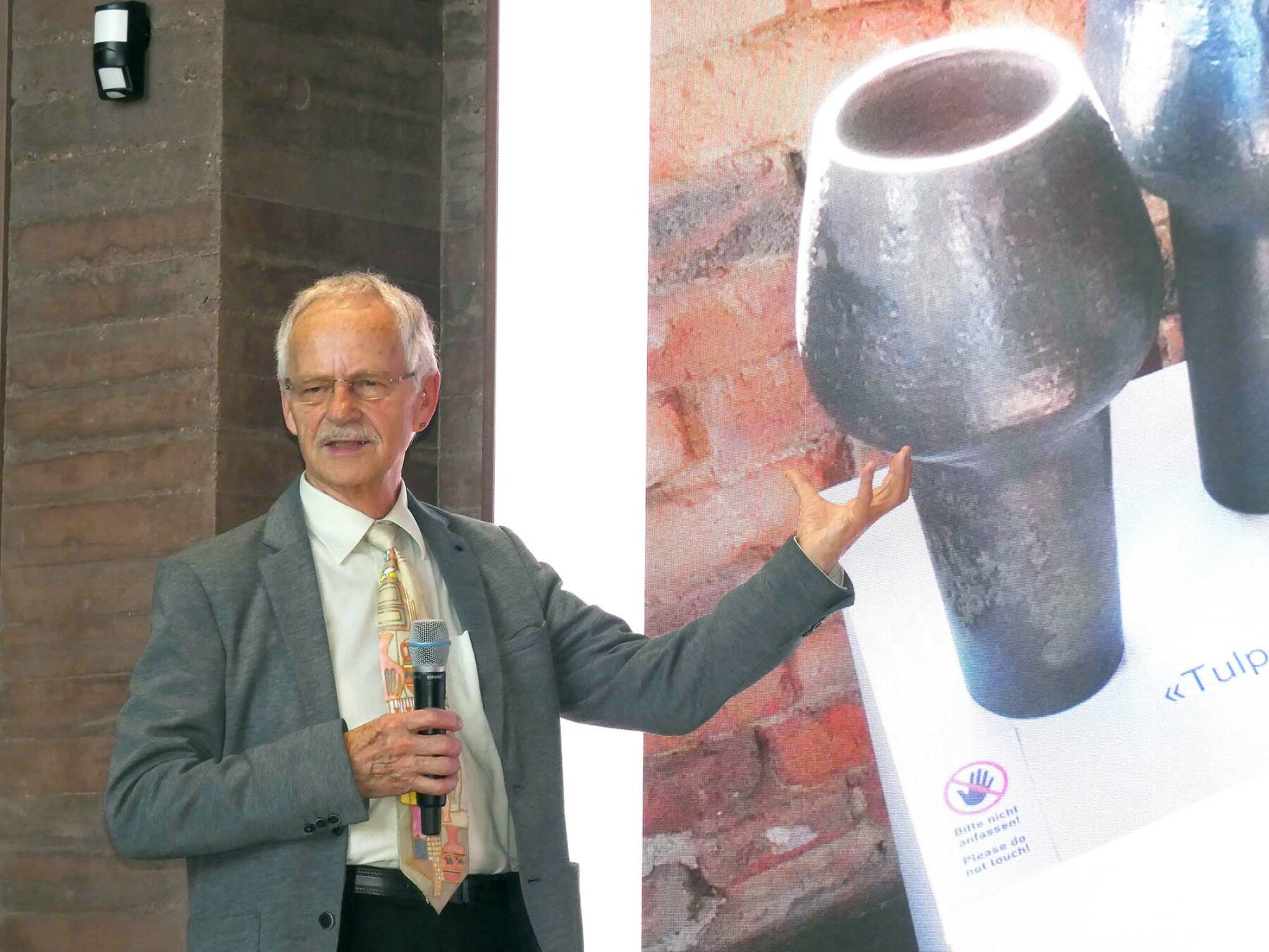 Im Anschluss vermittelte Bertram Sandfuchs eine Übersicht zu den Ausstellungsobjekten, „was mich persönlich fasziniert, ist unter anderem die Kunstfertigkeit changierender Farben.“ Johann Schreiber bedankte sich bei allen Anwesenden: „Damit ehren Sie nicht nur mein Keramikschaffen, sondern auch meinen verstorbenen Bruder Emil-Alexander als Ofensetzer-Meister und die fünf Generationen Schreiber vor uns beiden.“