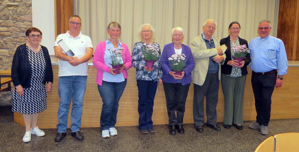 Heiner Krämer ist seit 25 Jahren als Hausmeister bei der Kirchengemeinde tätig. „Sein Einsatzgebiet umfasst alle Gemeinden der Seelsorgeeinheit und er ist ständig am Telefonieren, um seine Arbeit zu koordinieren“, erklärte Pfarrer Gerner. Ebenfalls seit 25 Jahren ist Gisela Albrecht Mitarbeiter der Kirchengemeinde. Ihre Einsatzgebiete sind der Blumenschmuck in der Kirche, die Pflege der Pfarrgärten sowie das Öffnen und Abschließen der Kirche. Außerdem ist sie seit zehn Jahren für den Bibelgarten auf dem Kirchplatz verantwortlich.
