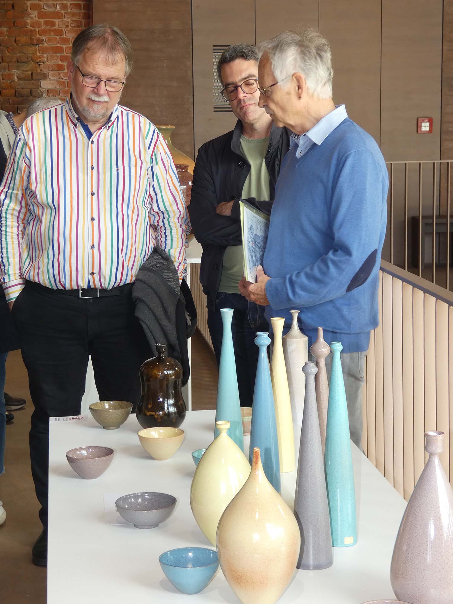 Foto: Inka Kleinke Bialy„Diese Vase ist so wuchtig wie es mein Urgroßvater war, der hatte riesige Pranken“, mit diesen Worten beginnt Johann Baptist Schreiber die Führung seiner Keramikausstellung im Rundofen. Es ist Samstagvormittag und seine Zuhörer und Zuhörerinnen sind Mitglieder des Schweizer Vereins der Keramikfreunde. Dem gehören Keramiksammler an, Keramikschaffende und Kunstfreunde, sowie Fachleute von Museen, Denkmalämtern, archäologischen Diensten, Hochschulen und des Kunsthandels.