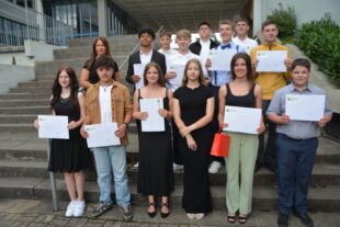 32 Schülerinnen und Schüler der Werkrealschule nahmen gestern Abschied vom Bildungszentrum Ritter von Buß. Die Klasse W9a mit Klassenlehrerin Tanja Köbele (links) und die Klasse W9b mit Klassenlehrerin Myriam Litterst (rechts) freuten sich gemeinsam über ihren Schulabschluss.