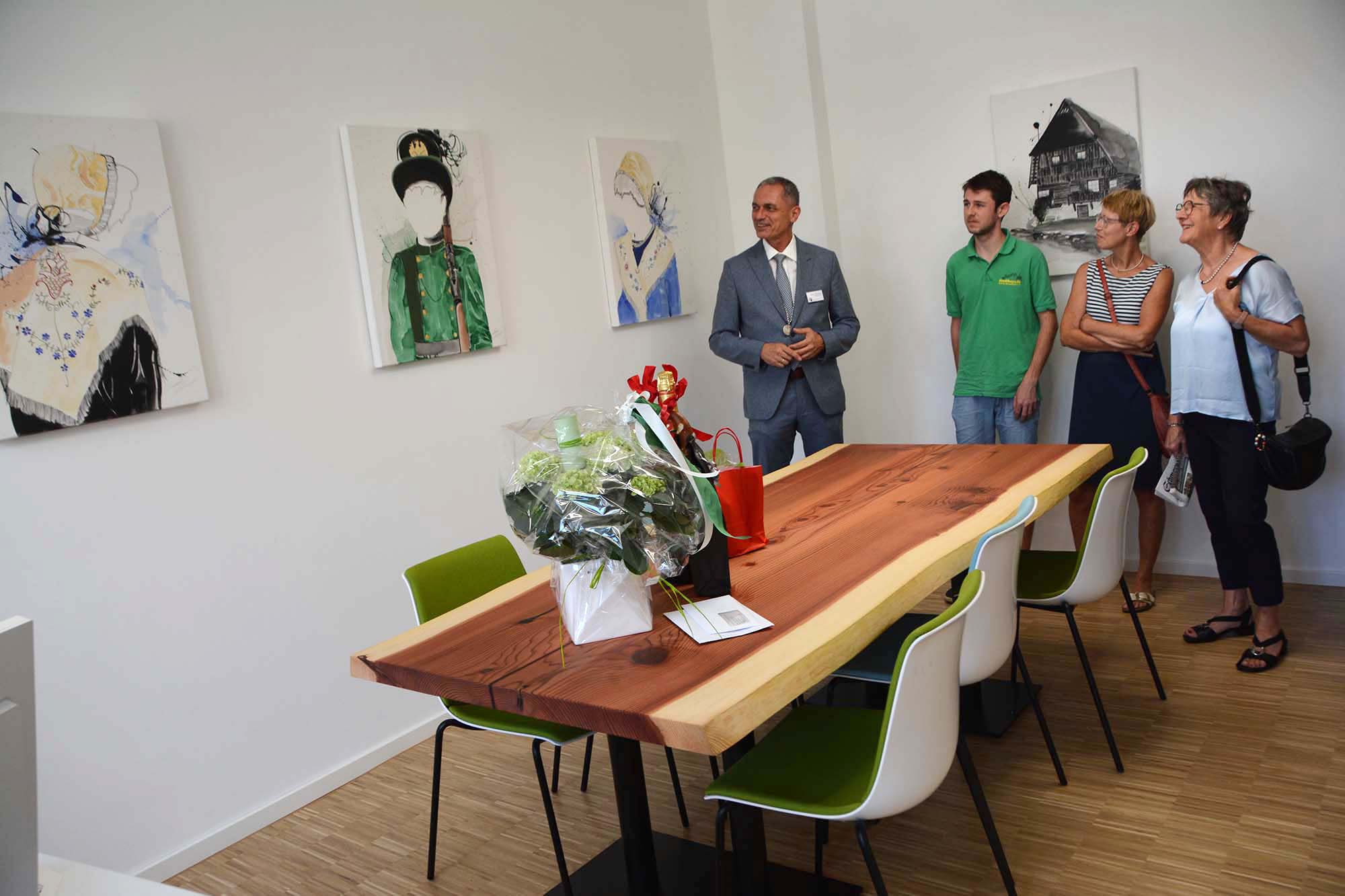 Das Büro ist nun mit einem großen Besprechungstisch ausgestattet, den die Schreinerei Alender aus Mammutbaum maßgefertigt hat. Allerdings ist das Holz nicht von dem Mammutbaum, der einst am Stadteingang stand und vom Blitz getroffen wurde, war zu erfahren. Die Trachtenmotive, die das Büro von Bürgermeister Pfundstein zieren, stammen aus der Feder des Hornberger Künstlers José Schloss. Gerne präsentierte das Stadtoberhaupt auch die schmale Fluchttür, durch die er sein Büro im Fall der Fälle schnell verlassen kann. Und wer wollte, konnte sich auf den Bürostuhl setzen und sich für einen Moment wie der Zeller Bürgermeister fühlen.