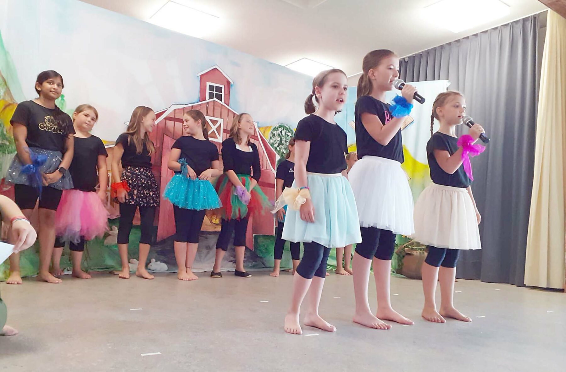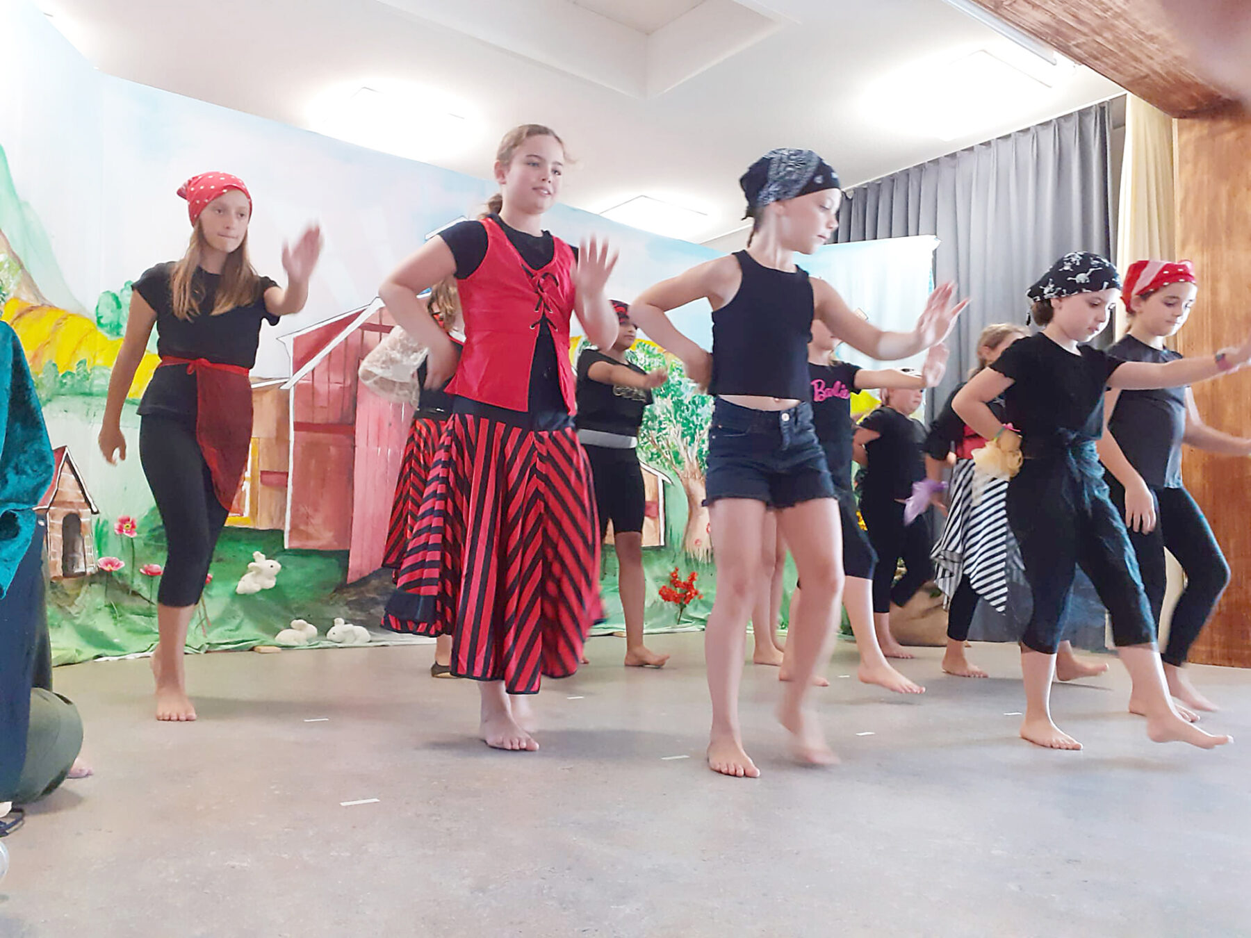 Die elf Mädchen tanzten zu „Sofia“ des deutsch-spanischen Sängers Alvaro Soler. Danach folgte ein kleines Ratespiel. Mit der Ansage: „Tiere, die gut schwimmen können“ bezogen die Ansagerinnen dann das Publikum mit ein und stimmten sogleich das bekannte Lied „Alle meine Entchen“ an. Mit dem „Liebe kleine Schwarzwaldmarie“ eroberten zwei Mädchen die Herzen des Publikums. Einige Zuhörer*innen im Saal stimmten mit ein oder schlugen den Takt mit. Als Piraten verkleidet führten elf Mädchen einen „Piratentanz“ auf, gefolgt von der Tritsch-Tratsch-Polka von Johann Strauß (Sohn). Zusammen mit Katja Prochazkova-Körnle tanzten die elf Mädchen hochkonzentriert, locker und frei.
