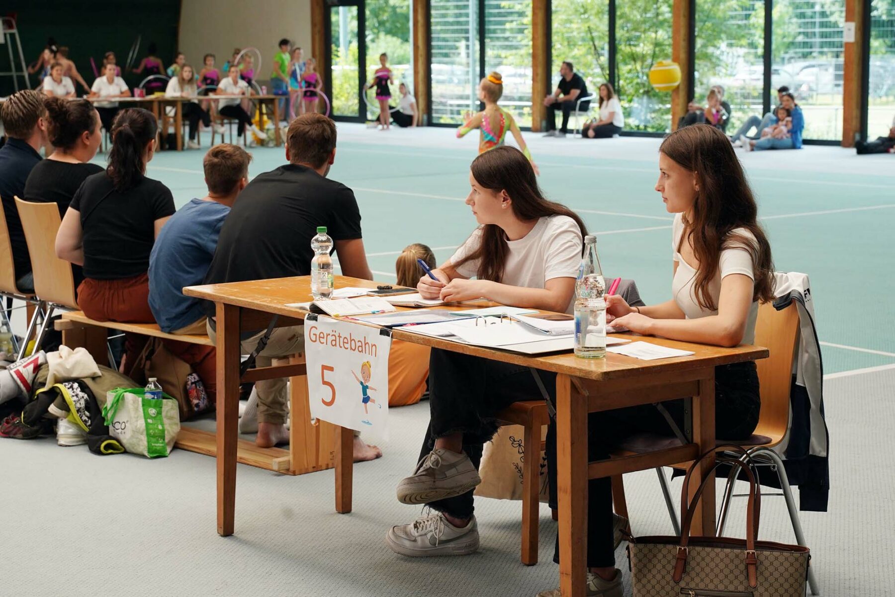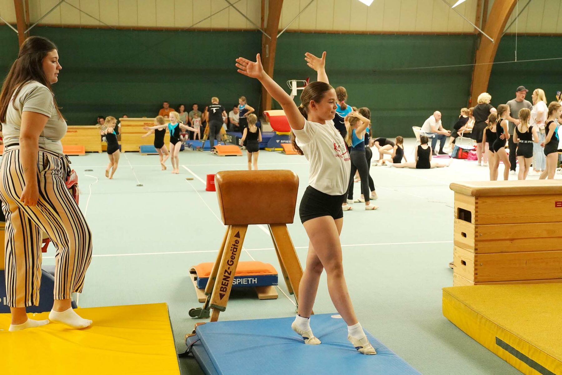 Damit diese hohe Zahl an Sportlern an einem Vormittag vor Kampfrichtern turnen kann, braucht es viele Kampfrichter und noch mehr Turngeräte. Diese Geräte brauchen Hallen und Flächen.