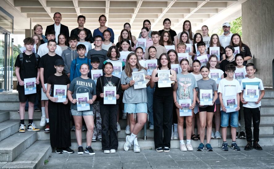 52 Schüler des Bildungszentrums „Ritter von Buss“ glänzen beim Europäischen Wettbewerb. Am letzten Schultag gratulierte Bürgermeister Pfundstein zum Erfolg.
