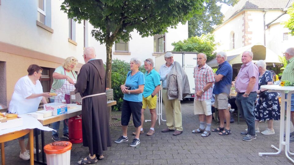 Nach der Feier nutzten die vielen Pilger die Gelegenheit, sich auf dem Kirchplatz zu treffen oder das Angebot im schattigen Klosterhof anzunehmen. Dort hatten die Helfer alle Hände voll zu tun, um die vielen Kunden zu bedienen.