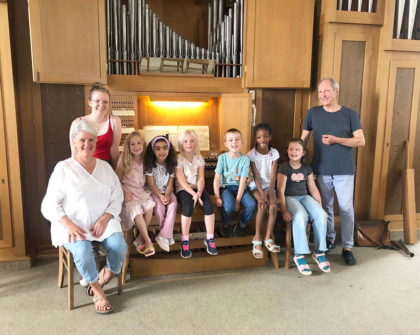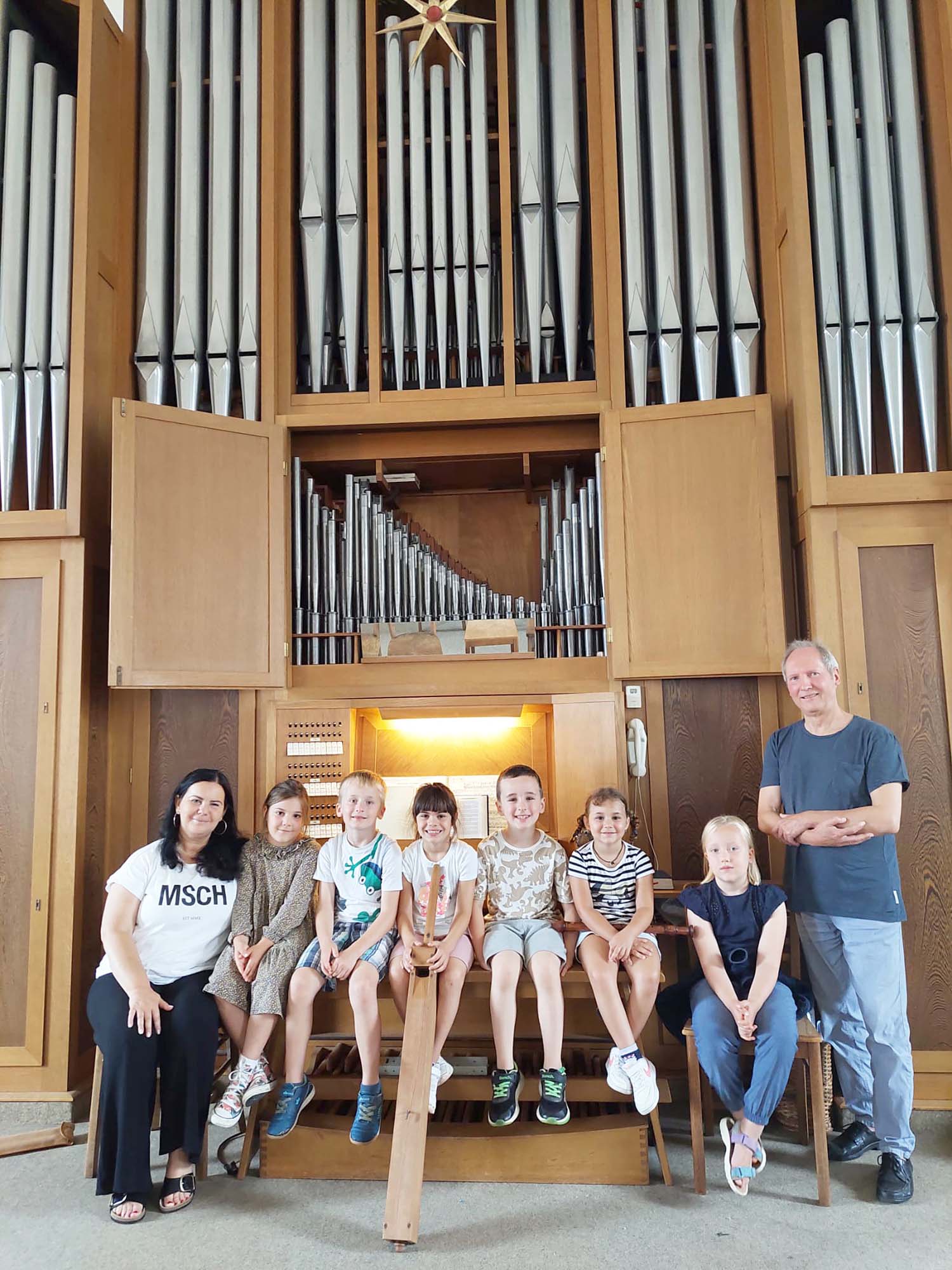 Kaum war die Gruppe in der Kirche angekommen, wurde sie vom feinen Klang des Zimbelsterns begrüßt. Gemeinsam stiegen sie die Treppe zur Orgel empor und wurden dort von dem Organisten Dieter Friede empfangen. Die Kinder staunten und hörten seinen Erklärungen gespannt zu. Dann musizierten die Kinder sogar alle einmal einzeln, gemeinsam und mit Friede auf der Orgelbank. Zum guten Schluss sangen die Kinder mit ihren schönen Stimmen, begleitet von Orgelmusik das Lied „Geh’ aus mein Herz und suche Freud‘ in dieser schönen Sommerszeit, an Deines Gottes Gaben!“