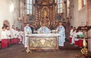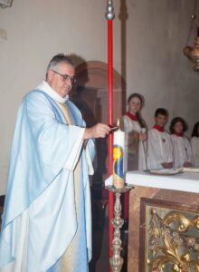 Zu Beginn des Gottesdienstes weihte Pfarrer Bonaventura Gerner, der mit den beiden Patres Irenäus und Christoph konzelebrierte, die traditionell gestiftete Votivkerze und entzündete sie an der Osterkerze.