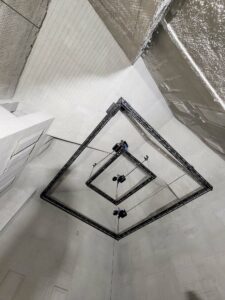Zunächst wurden Konsolen für die Antriebstechnik in die imposante Architektur des Siedle Hauses integriert. Mit der Antriebstechnik von vier Bandzügen können insgesamt zwei Tonnen gehoben werden. Die Steuerung der ASM Steuerungstechnik GmbH bietet dem Nutzer höchsten Komfort und vielfältige Möglichkeiten die Traversenringe zu verfahren. Die Anlage verfügt über alle erforderlichen Sicherheitseinrichtungen und entspricht dem neuesten und gleichzeitig modernsten Stand der Technik.