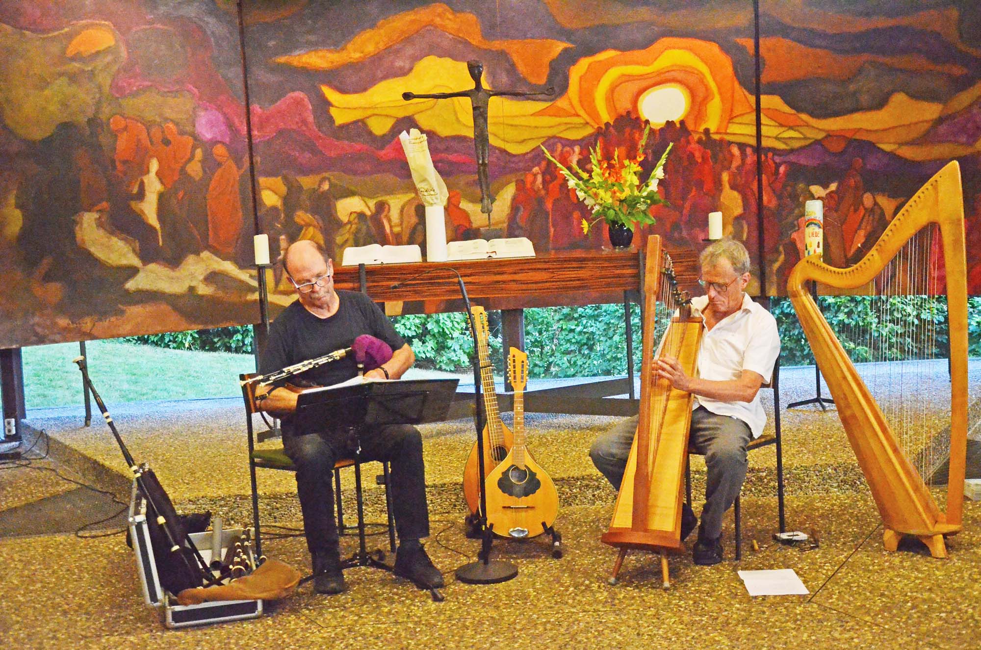 Sanfte, engelsgleiche Töne schrieb man von je her der Harfe zu, erklärte Tom Daun. Von der mythisch-religiös besetzten Harfe Ägyptens und anderer Kulturen gab es erstaunliche Entwicklungen – bis hin zum bürgerlichen Salon des 19. Jahrhunderts, als die Harfe eindeutig mit dem Weiblichen konnotiert wurde. Noch heute spielen in den großen Orchestern meist Frauen die Konzertharfen. Tom Daun wechselte am Mittwochabend zwischen der keltischen – und der böhmischen Harfe.