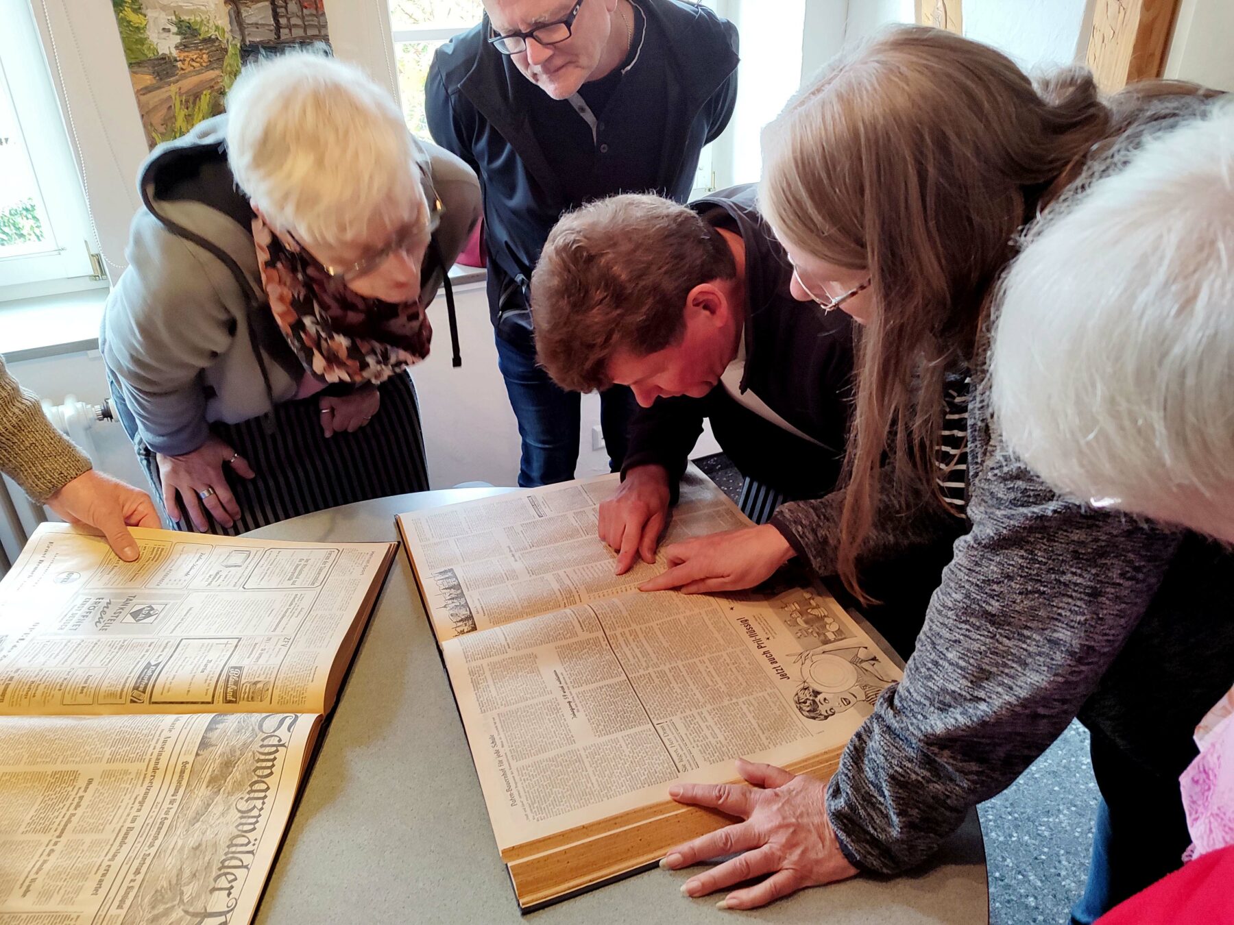 In zwei Gruppen wurde dann die „Schwarzwälder Post“ erkundet. Inhaber Hanspeter Schwendemann begrüßte die Gruppen und führte sie direkt in das Zeitungsarchiv, wo er schon die Zeitungsbände mit den Ausgaben von 1959 vorbereitet hatte. Unter der Rubrik „Geburten“ konnte jeder seine Geburtsanzeige nachlesen. Interessant waren auch die Werbeanzeigen von Firmen, die heute zum Teil nicht mehr existieren. Am liebsten hätten die Schulkameraden die ganzen Zeitungsbände durchgeblättert, aber aus zeitlichen Gründen war dies leider nicht möglich.
