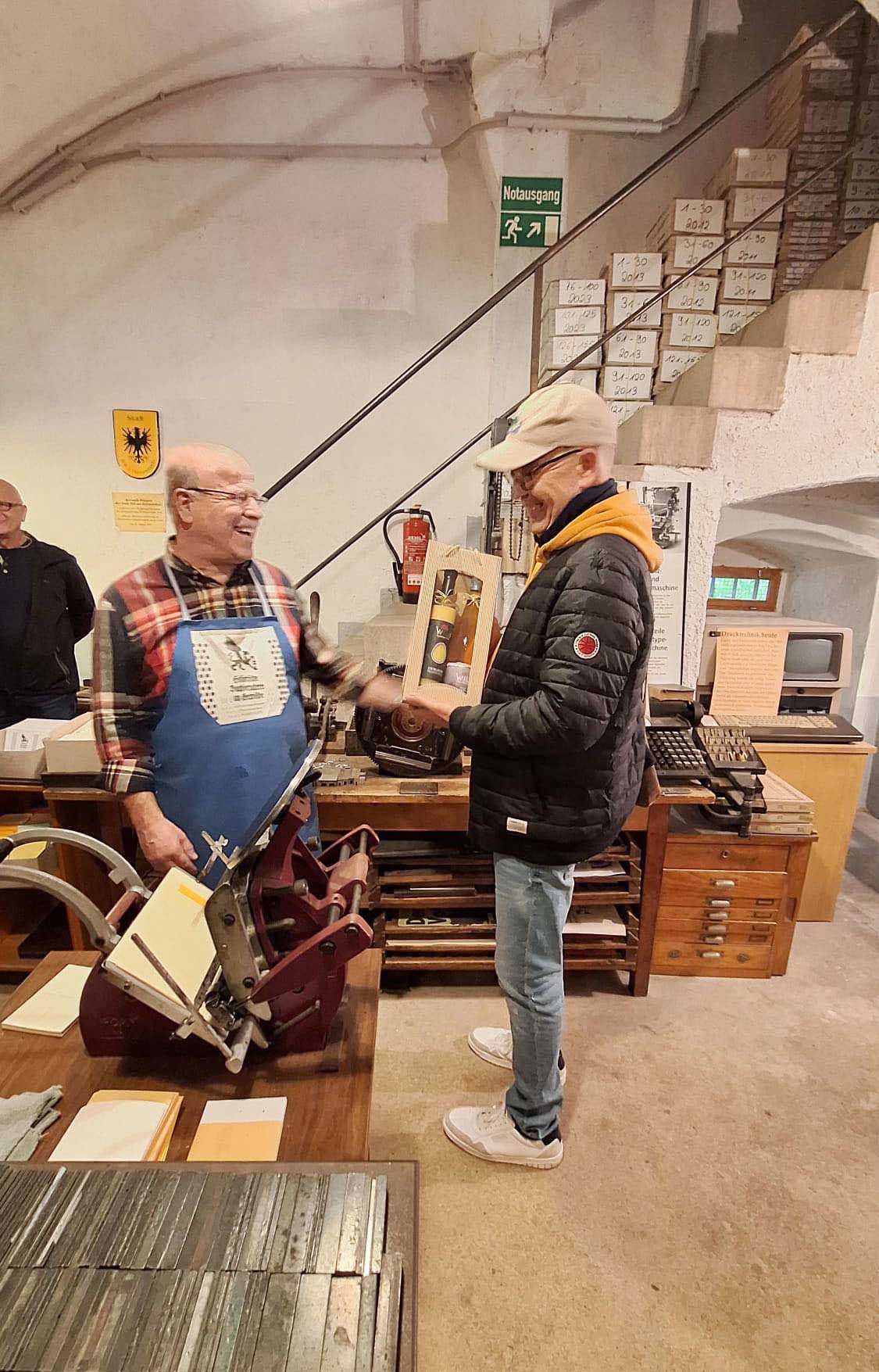 Nach dem Rundgang bedankte sich Reinhard Berger bei Hanspeter Schwendemann für die sehr interessante Führung und übergab ihm als kleines Dankeschön ein kleines Präsent.