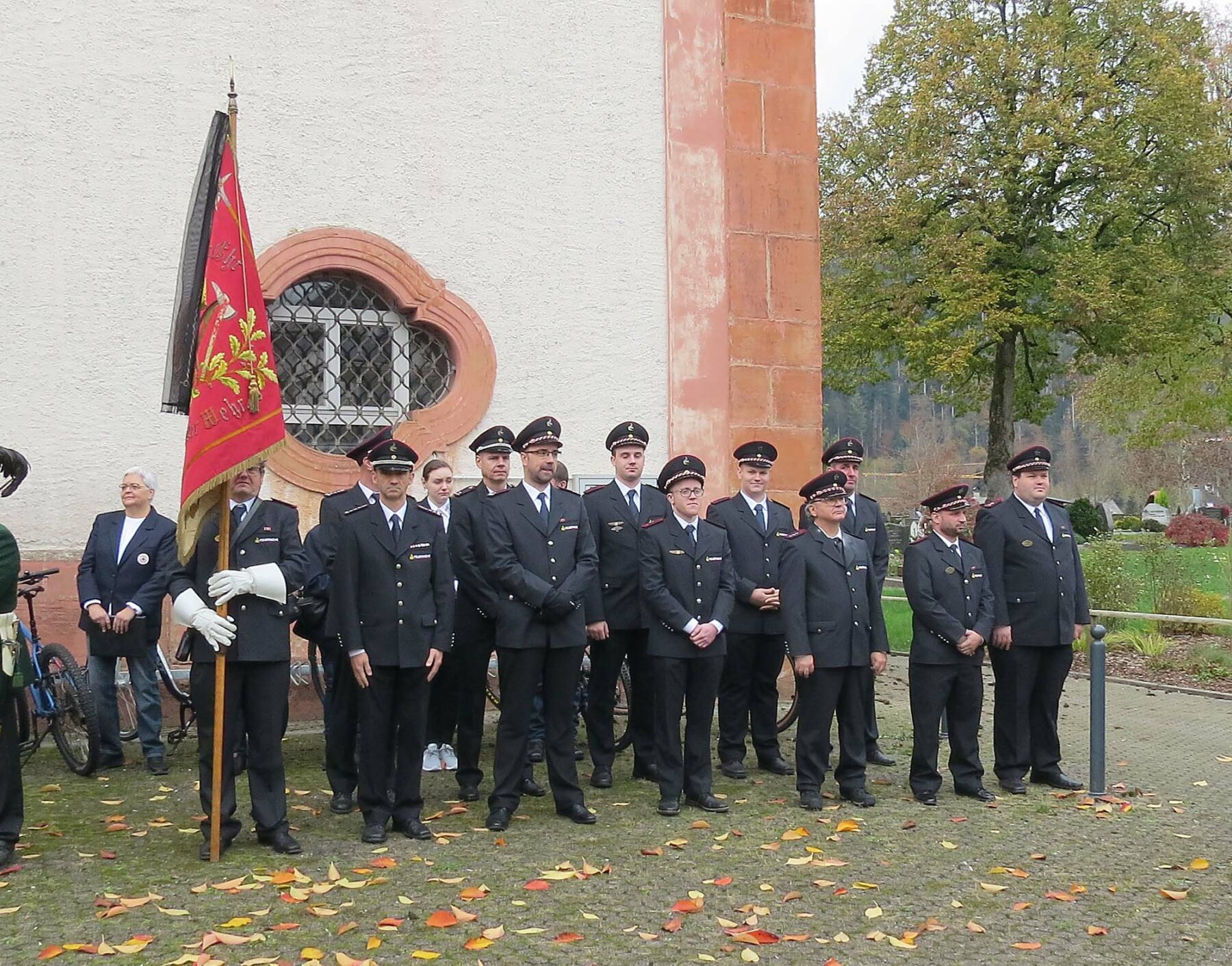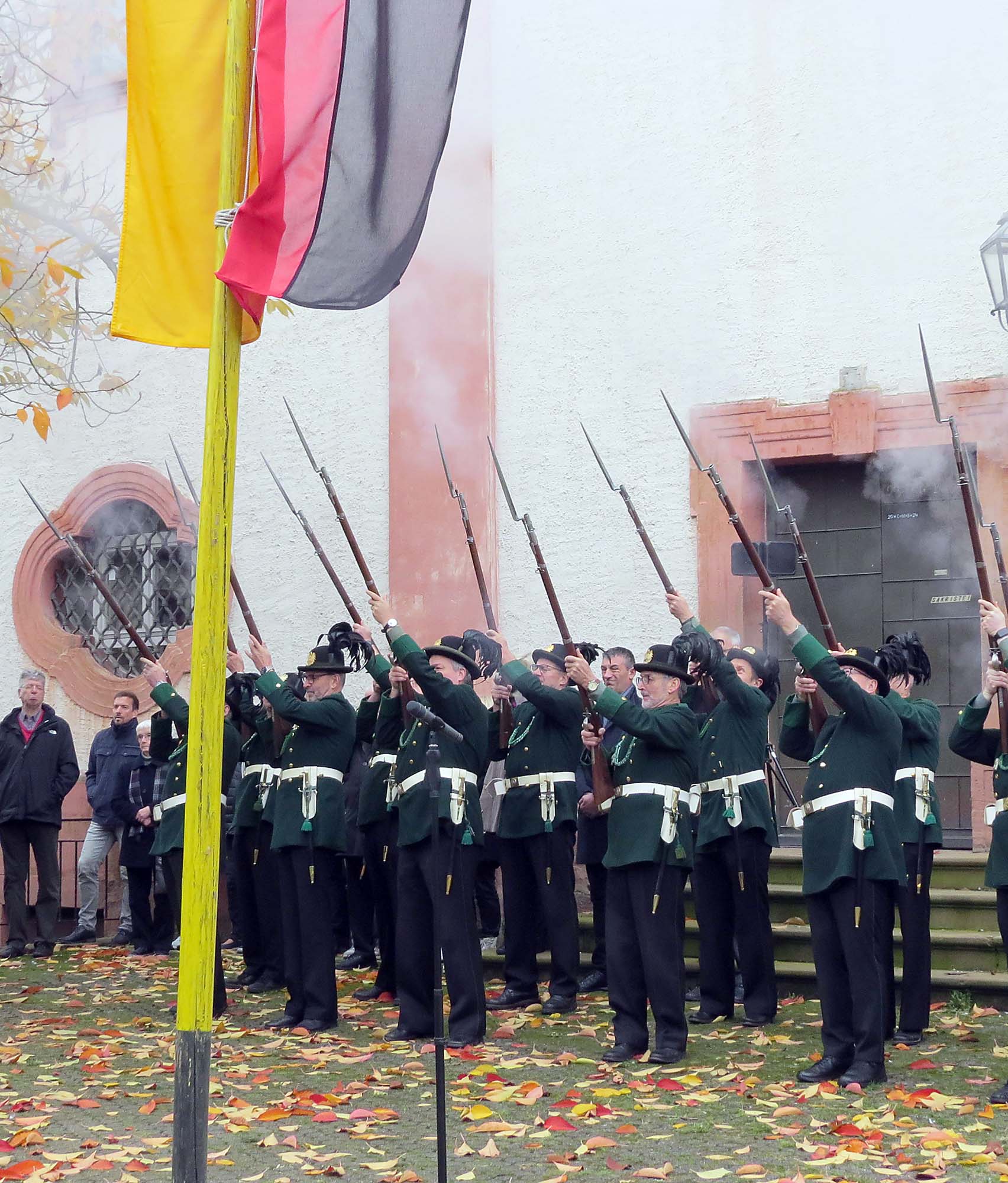 Vertreter der Bürgerwehr hielten Ehrenwache vor dem Kriegerdenkmal. Das Denkmal befindet sich vor der Pfarrkirche vor dem Eingang zur Sakristei. Auf dem kleinen Vorplatz findet die jährliche Gedenkfeier statt. Foto: Gisela Albrecht