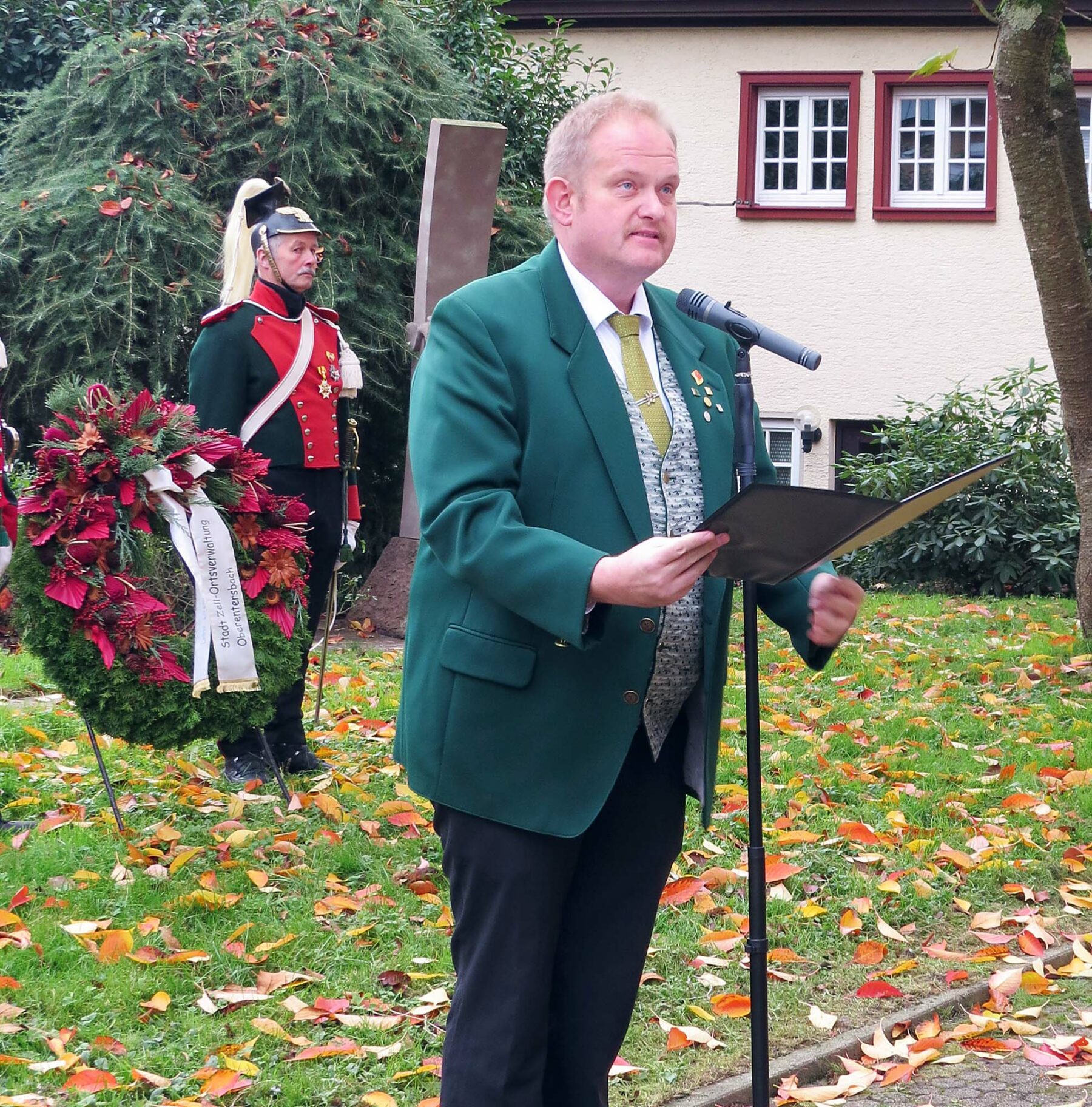 Volkstrauertag am Kriegerdenkmal in Zell: Rede von Bürgermeister- Stellvertreter Stefan Polap. Würdiger Rahmen durch die Bürgerwehr, Feuerwehr, den Gesangverein Frohsinn und die Stadtkapelle.