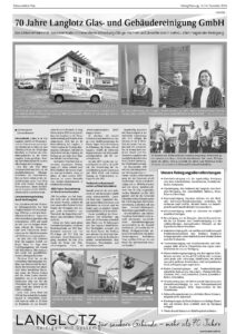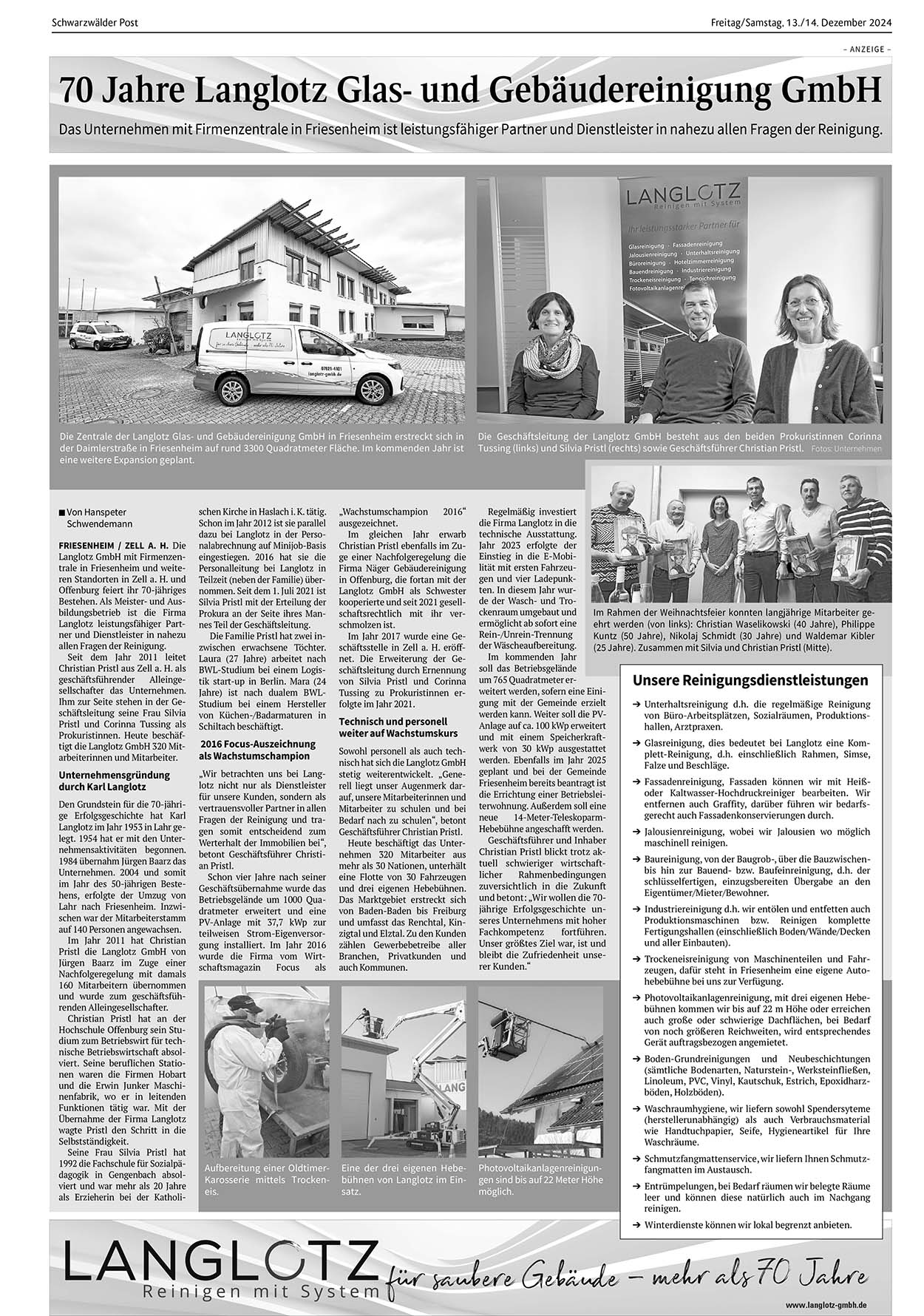 Die Langlotz GmbH mit Firmenzentrale in Friesenheim und weiteren Standorten in Zell a. H. und Offenburg feiert ihr 70-jähriges Bestehen. Als Meister- und Ausbildungsbetrieb ist die Firma Langlotz leistungsfähiger Partner und Dienstleister in nahezu allen Fragen der Reinigung.