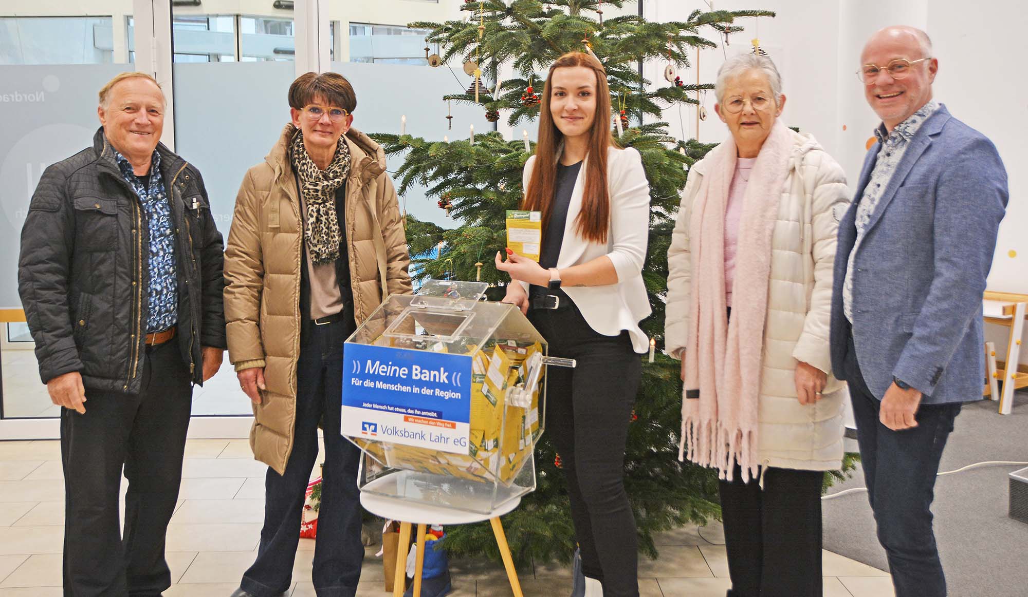 Bei der Schlussziehung des Weihnachtsgewinnspiels (von links): Paul Lehmann, Andrea Giesler, Glücksfee Jelena Jolic, Jutta Schmid und Volksbank-Filialleiter Mathias Hug. Foto: Hanspeter Schwendemann