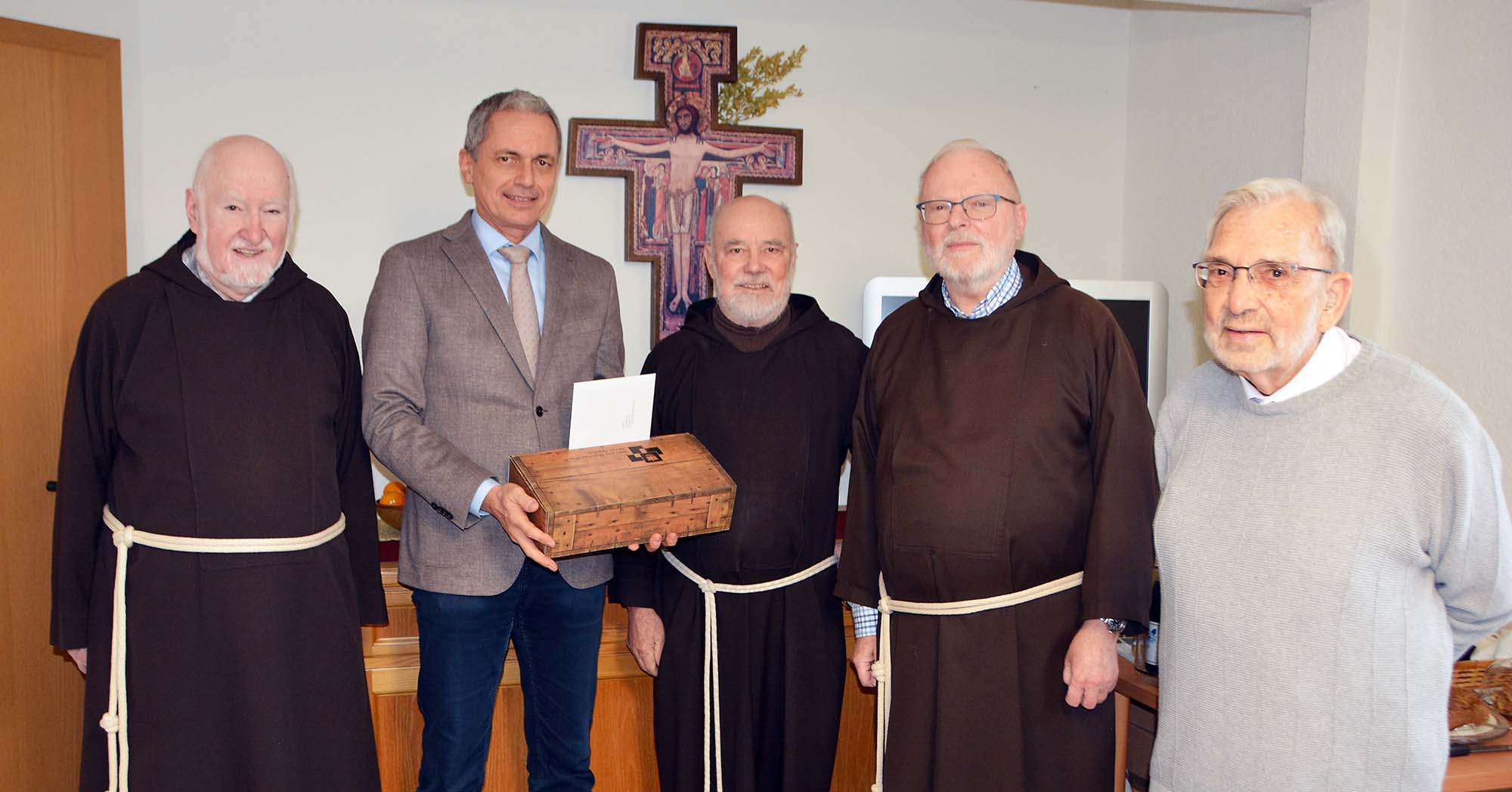 Bei einem Adventskaffee wurde gestern der 80. Geburtstag von Bruder Linus nachgefeiert. Auch Bürgermeister Günter Pfundstein ließ es sich nicht nehmen, dem Jubilar zu seinem runden Wiegenfest die besten Wünsche der Stadtgemeinschaft und auch persönlich zu überbringen. Vom Obergeschoss des Konvents schweift der Blick hinüber zum Klostergebäude und zur Wallfahrtskirche „Maria zu den Ketten“, die von den Kapuzinern bis zum Abschied an Pfingsten 2023 über 100 Jahre lang betreut wurde.