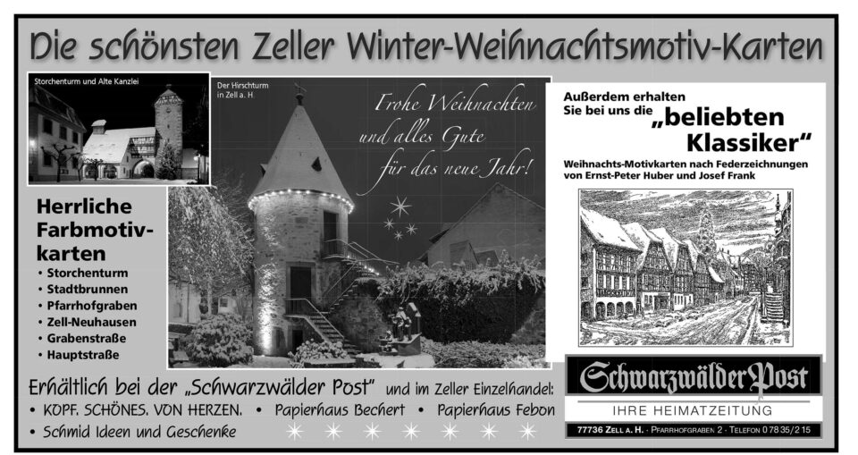 - Anzeige -Anzeige, Zell am Harmersbach | 4.12.2024 Die schönsten Zeller Winter-Weihnachtsmotiv-Karten Foto: Foto: SP von Schwarzwälder Post Das könnte Sie auch interessieren:Foto: privatGoldenes Leistungsabzeichen: Zwei…Foto: Reinhold Messner / MundologiaReinhold Messner: „Der Nanga Parbat hat…ZFV müht sich zum Unentschieden