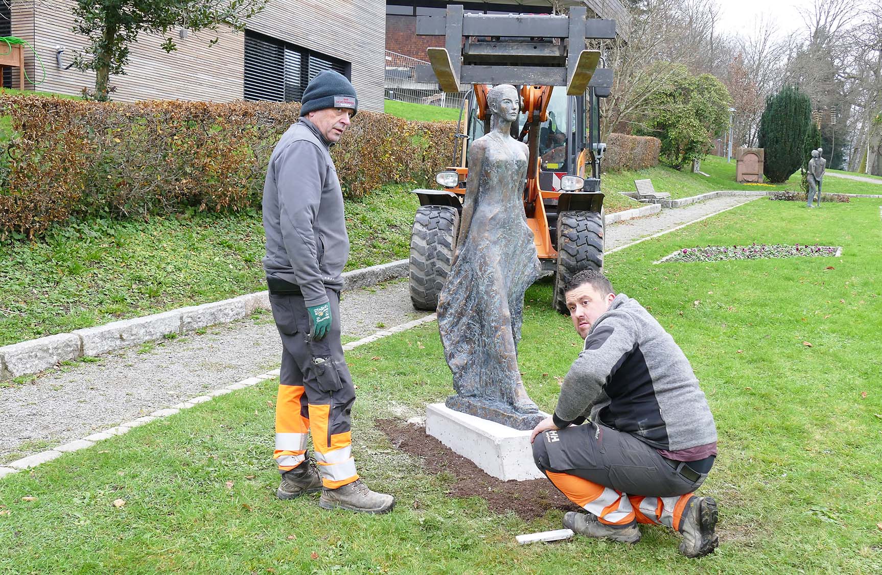 „Wissen Sie, ich bin viel in der Welt herumgekommen, und mir ist nichts passiert. Dann dieser Zwischenfall auf dem Kanzleiplatz. Ich hätte nicht gedacht, dass ich mich so schnell wieder erhole und ohne Gehstütze wieder laufen kann.“ Sein Blick schweift merklich auf eine Tüte mit Büchern. Ich ahne, dass dies sein Anschauungsmaterial ist. Er freut sich, dass die neue Skulptur nun steht. Dann die Anmerkung: „In meinem Alter weiß man nicht, was der nächste Tag bringt.“ Es scheint ihm wichtig, die Aufstellung noch selbst zu erleben. Dazu passend sagt er: „Jetzt bin ich wieder entspannter und kann besser schlafen.“ Unser Gespräch fokussiert sich auf die Skulptur mit dem Titel „Donna con Abito Lungo“ (Die Dame mit dem Abendkleid).